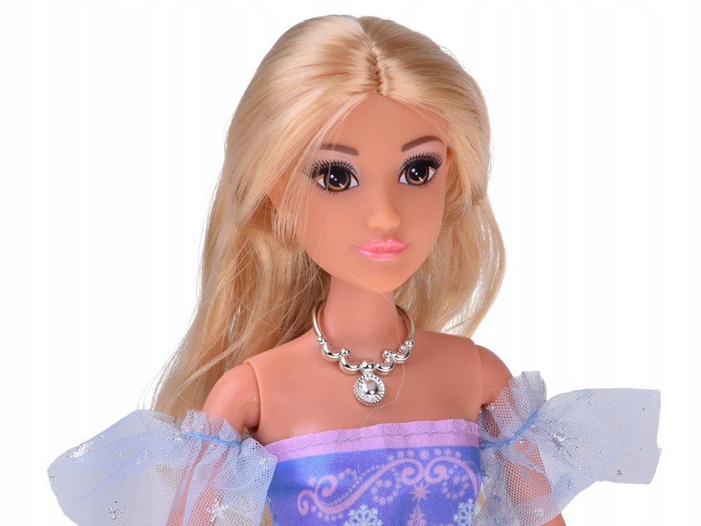 У принцессы длинные золотистые волосы, которые можно расчесывать и укладывать. Она одета в сиреневое бальное платье, украшенное блестящим тюлем и бантом. Ожерелье и тиара завершают образ.