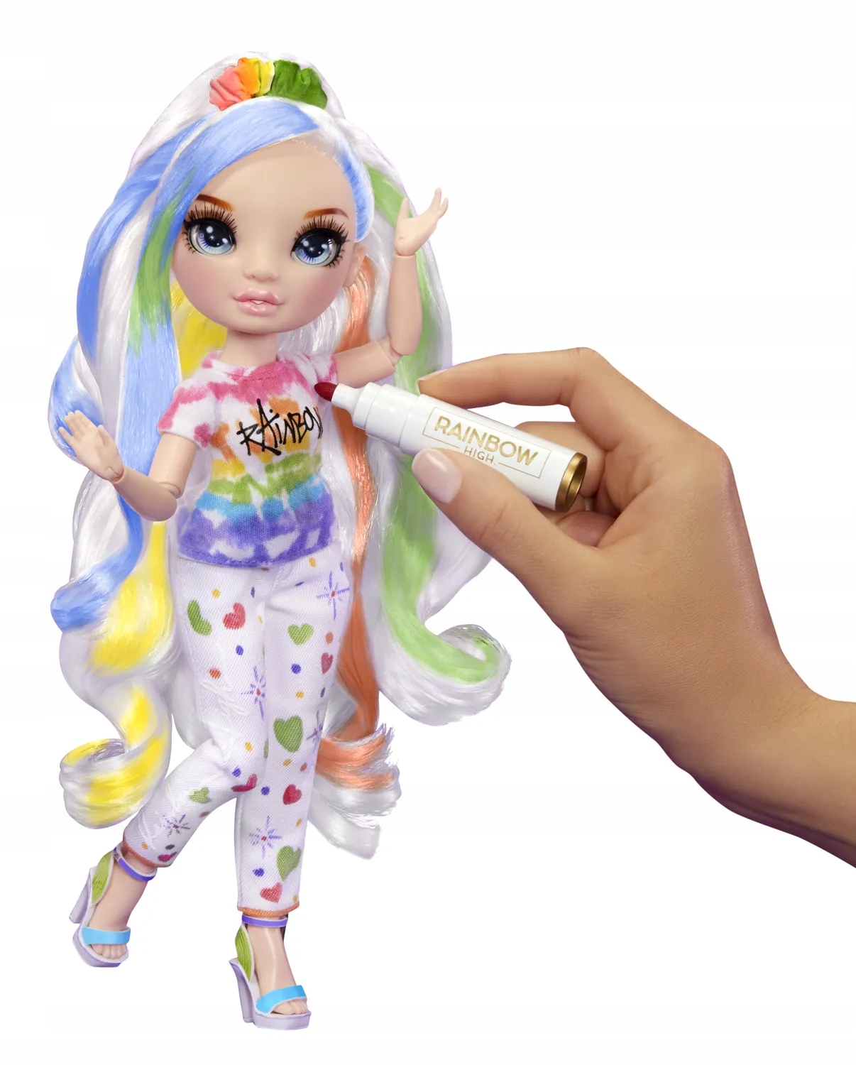 Rainbow High Color & Create — почувствуйте себя учеником знаменитой школы и создайте собственные наряды! Откройте для себя куклу в белом наряде, который можно раскрасить смываемыми маркерами! Создайте свою собственную куклу Rainbow High!