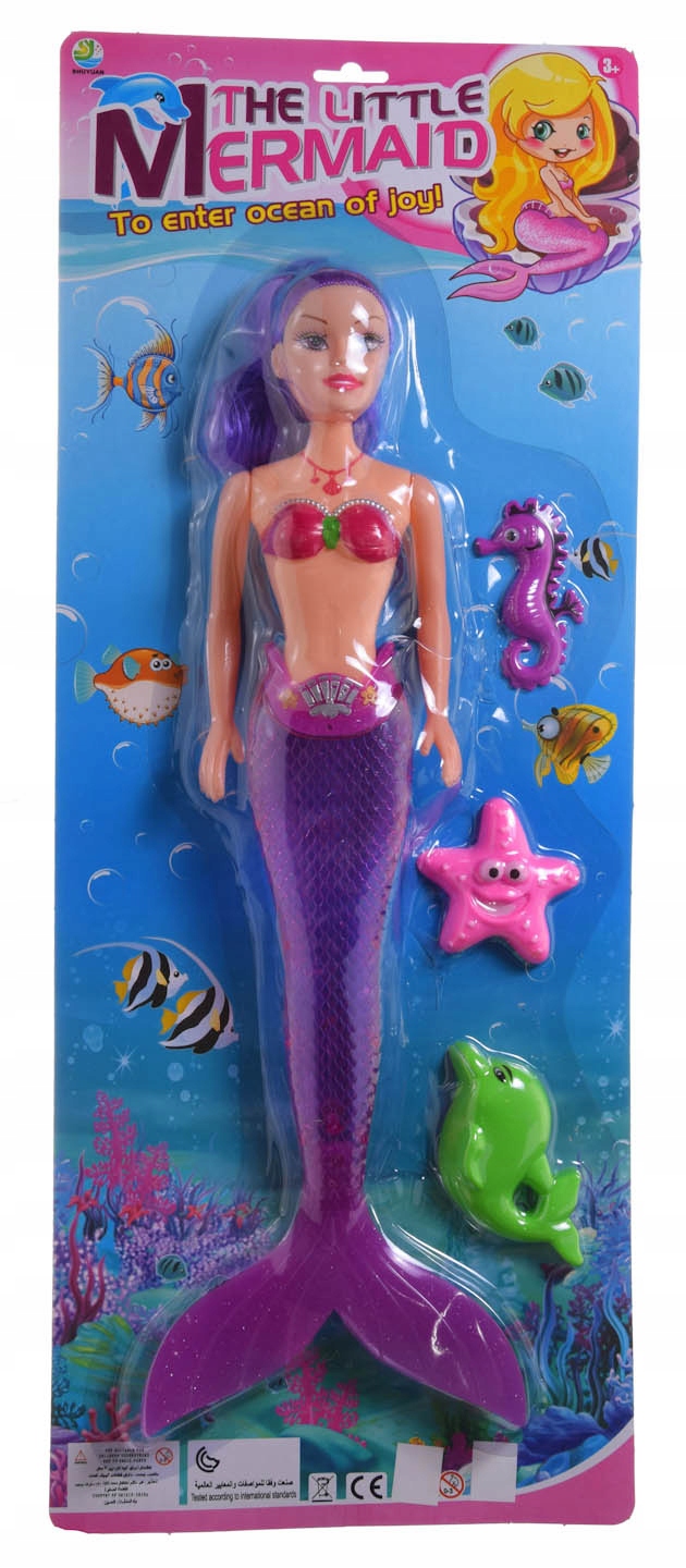 Красивая кукла с волосами под цвет хвоста. Хвост прозрачный, доступен в трех цветах: фиолетовом, розовом и зеленом. У куклы подвижные руки и голова. В набор входят маленькие морские животные. Кукла очень большая и добротно сделана. Размеры куклы: 48 х 9 х 5 см.