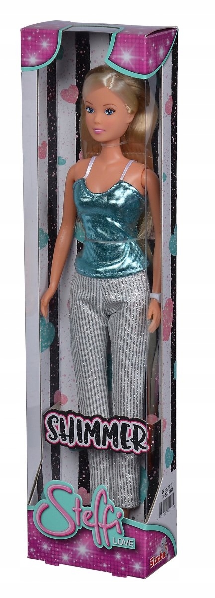 Кукла Штеффи одета в модный комплект в стиле спортивной элегантности - блестящий топ и брюки,