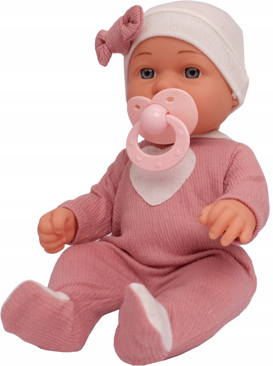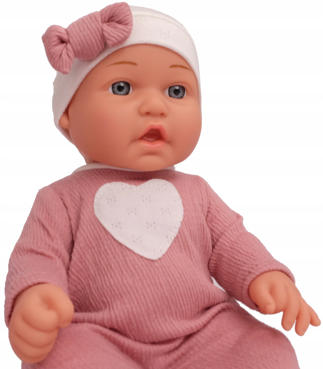 Малыш одет в тщательно сшитый розовый наряд. У него весёлое, милое личико и маленькие, стеклянные, серые глазки, чем-то напоминающие классических пупсов. Она выглядит как настоящий ребенок, одетый в мягкую одежду.