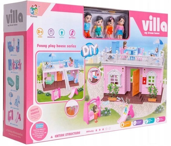 Двухэтажный дом состоит из столовой, спальни, санузла и большой террасы. В комплект входят необходимые аксессуары для оборудования и садовая мебель. Дом выполнен в эстетичных розовых тонах и выполнен из качественных материалов. Имеет открывающуюся дверь и световые эффекты.