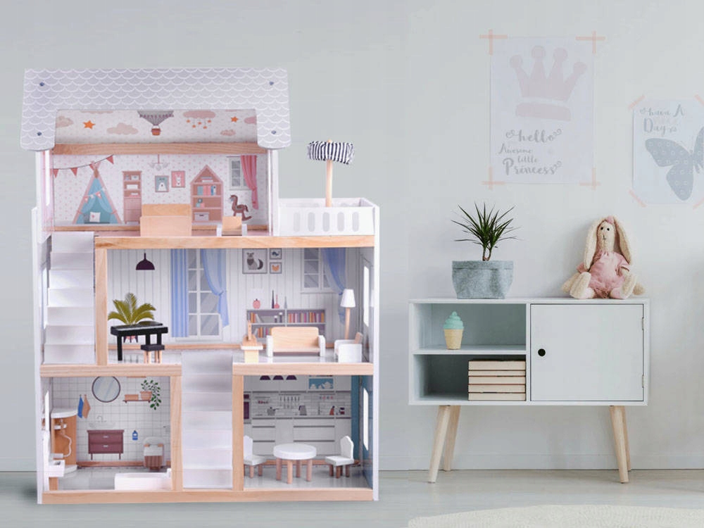 В доме 3 этажа, каждый из которых оформлен элегантно и стильно. Кукольный домик оснащен всей необходимой мебелью для комфортного функционирования.