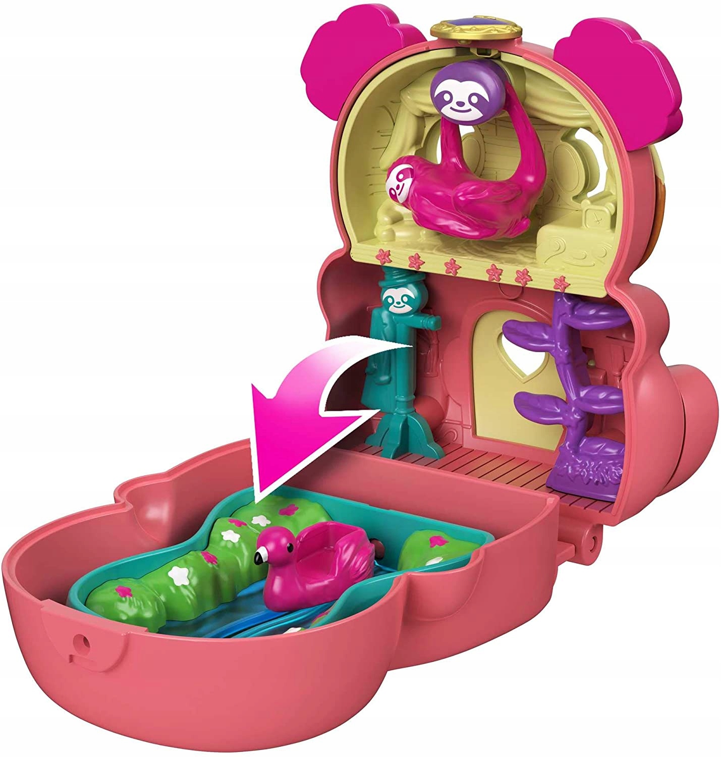 В коробке находится маленькая кукла Полли с пятью шарнирными соединениями, позволяющими ей принимать разные игровые позиции, а также фигурка ленивца. и забавные функции для открытий.