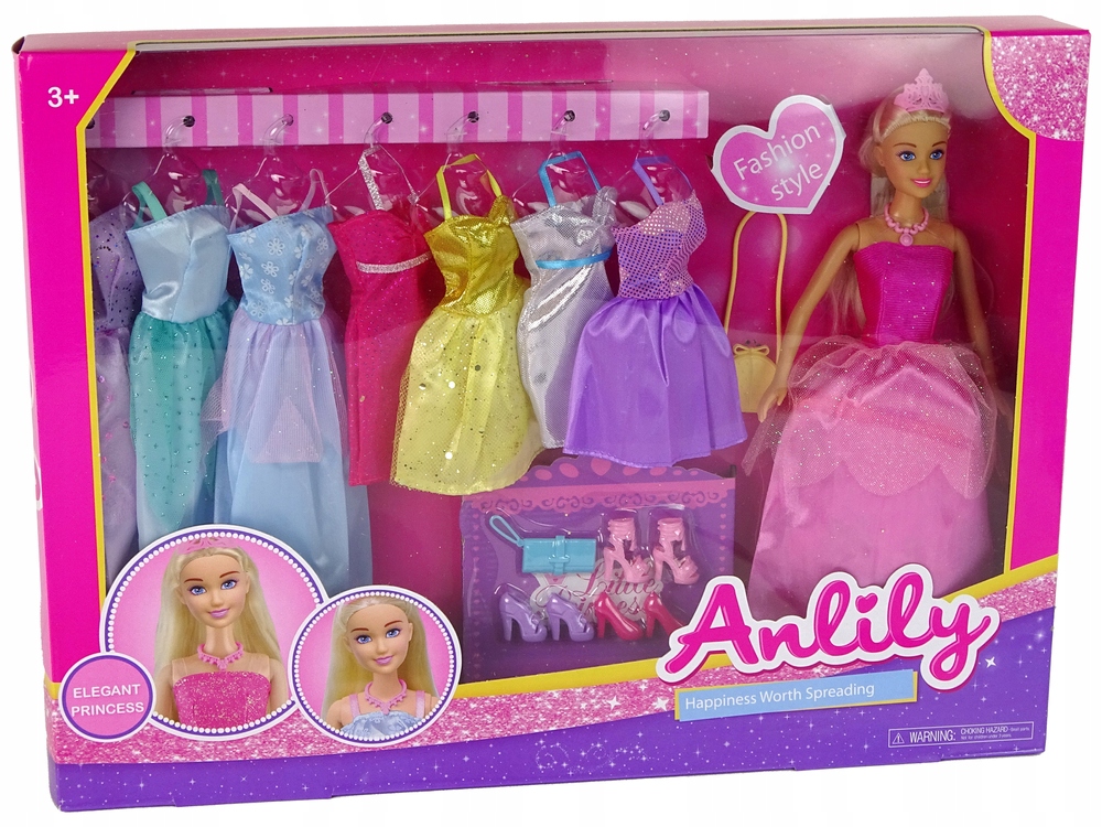 Мы найдем красивую куклу с длинными светлыми волосами и 8 ярких платьев с разными разрезы и текстуры материалов. Сумочки и туфли, входящие в комплект, дополнят наши наряды.
