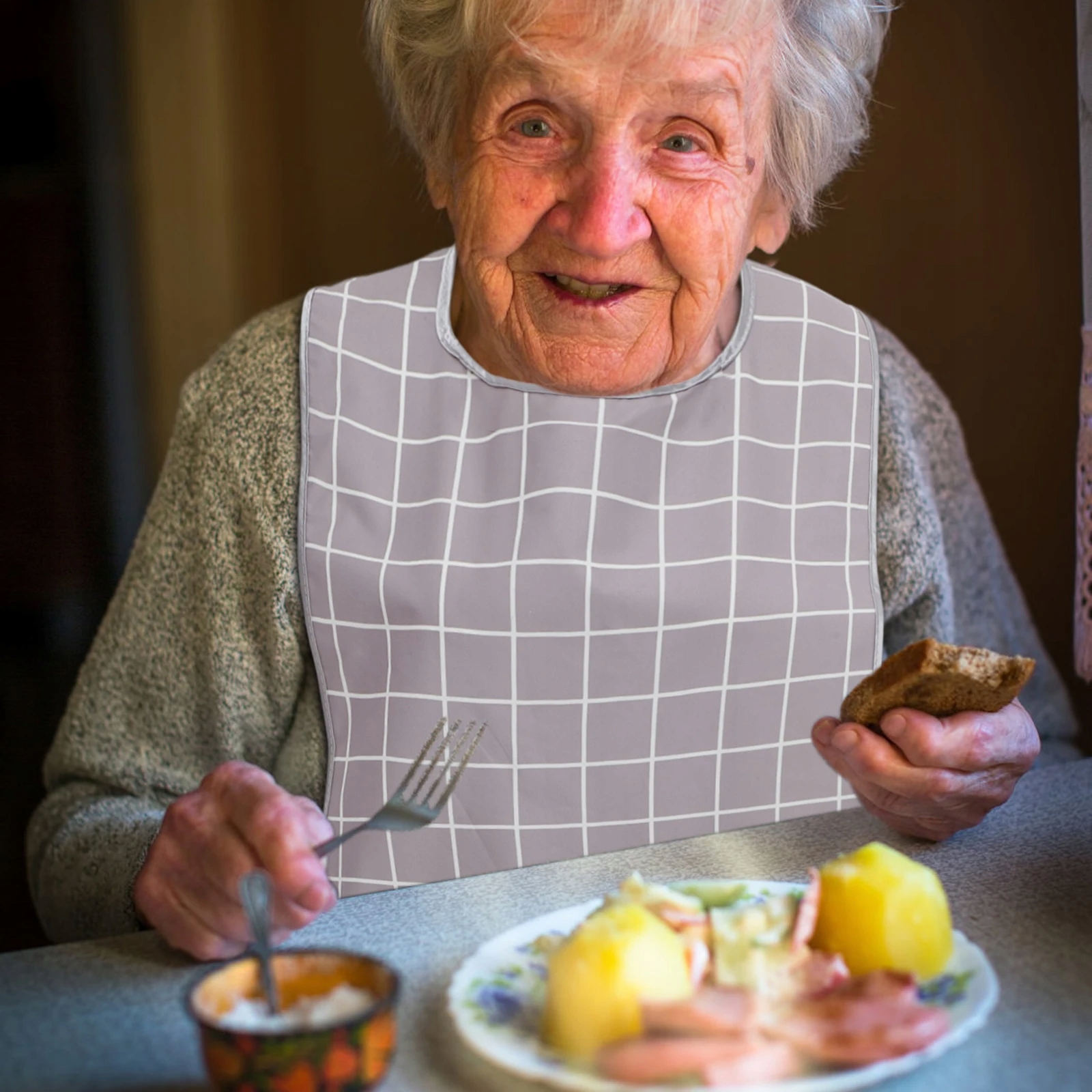 Люди похилого віку їдять нагрудник, дарують великі серветки