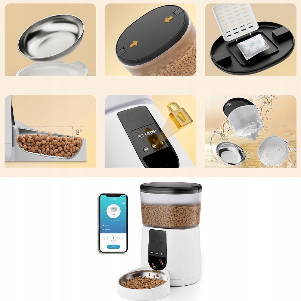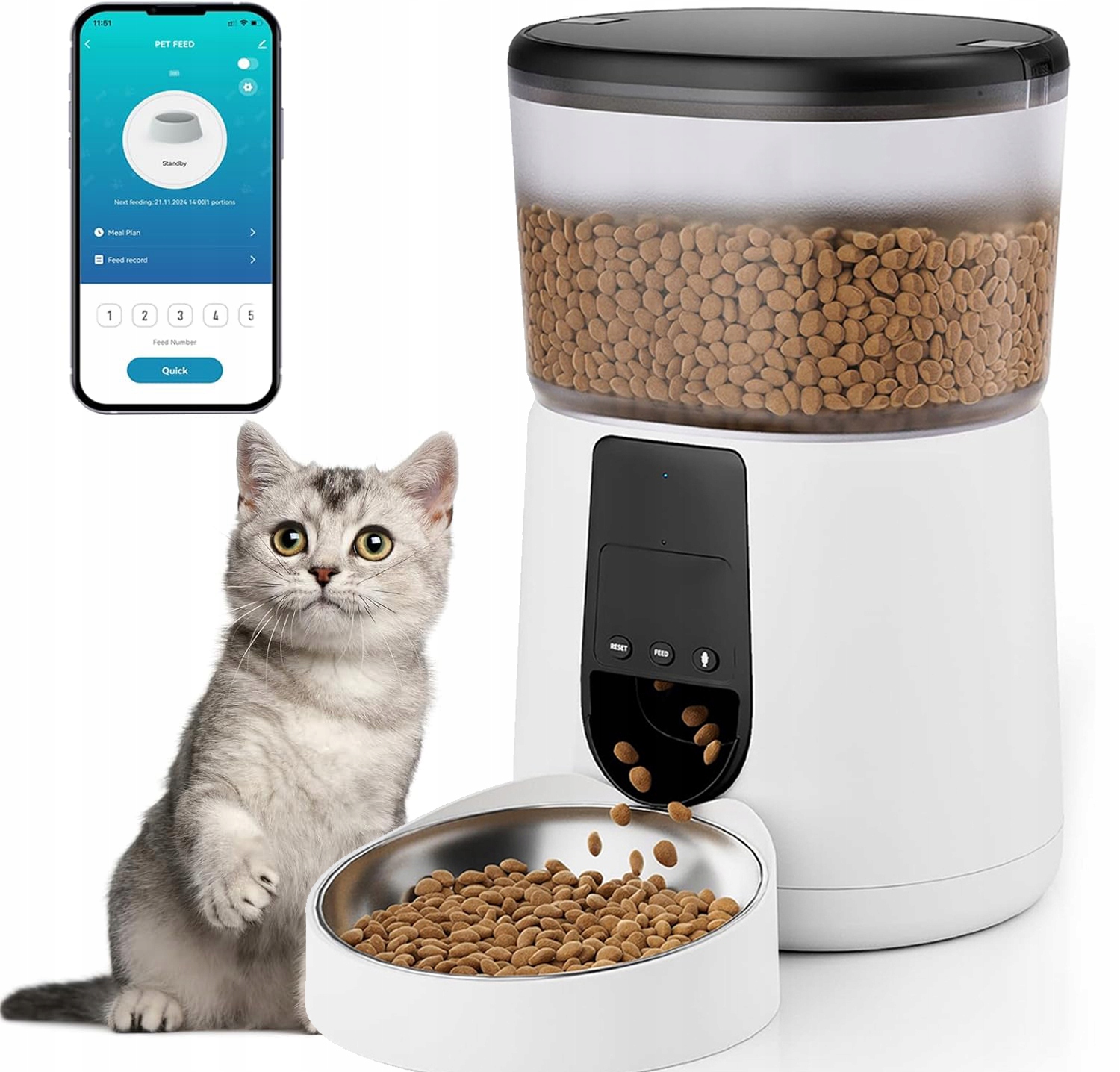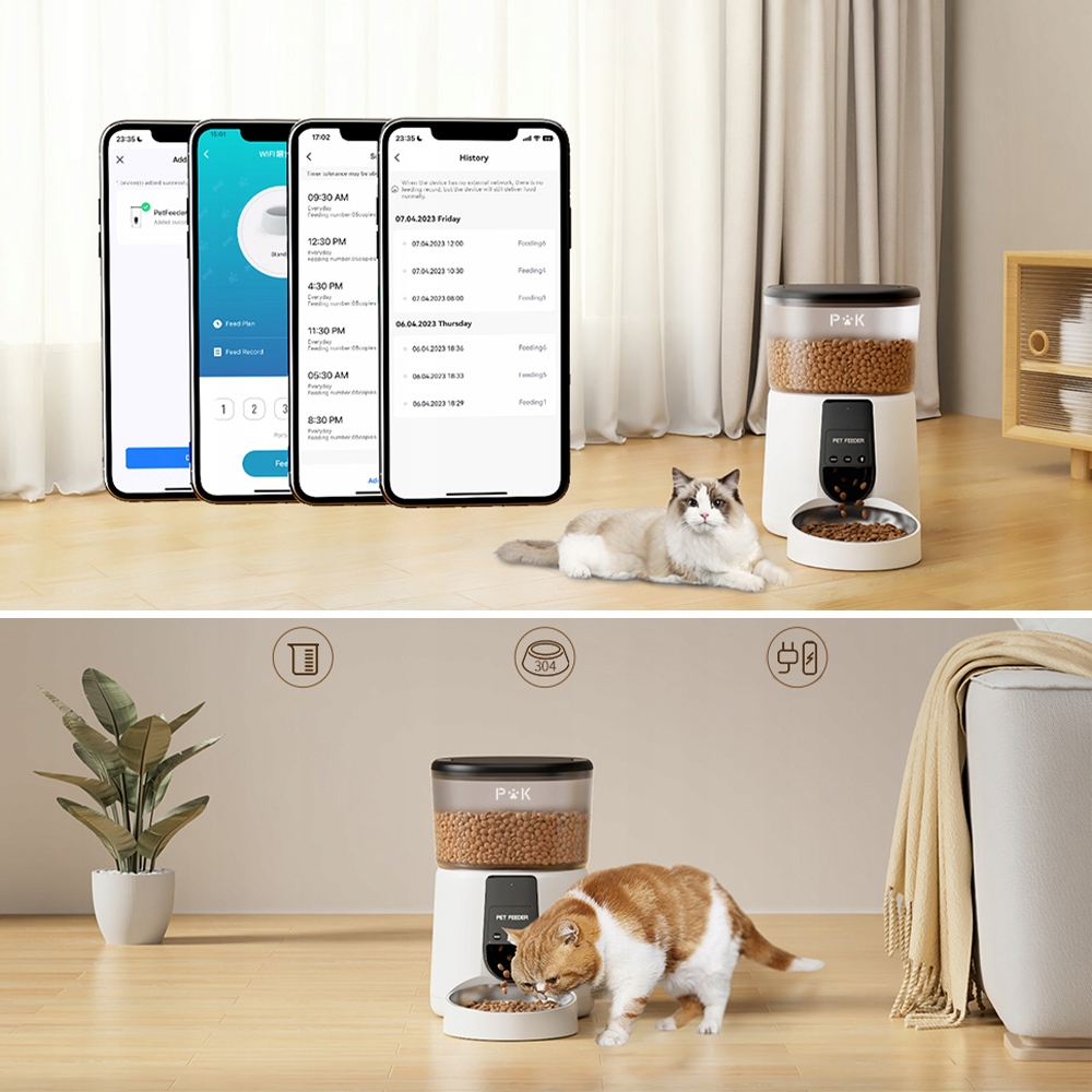 - Вы можете кормить своего питомца в любое время и поместить через телефон (с Android или iOS), а также отслеживать историю кормления, что облегчает управление.