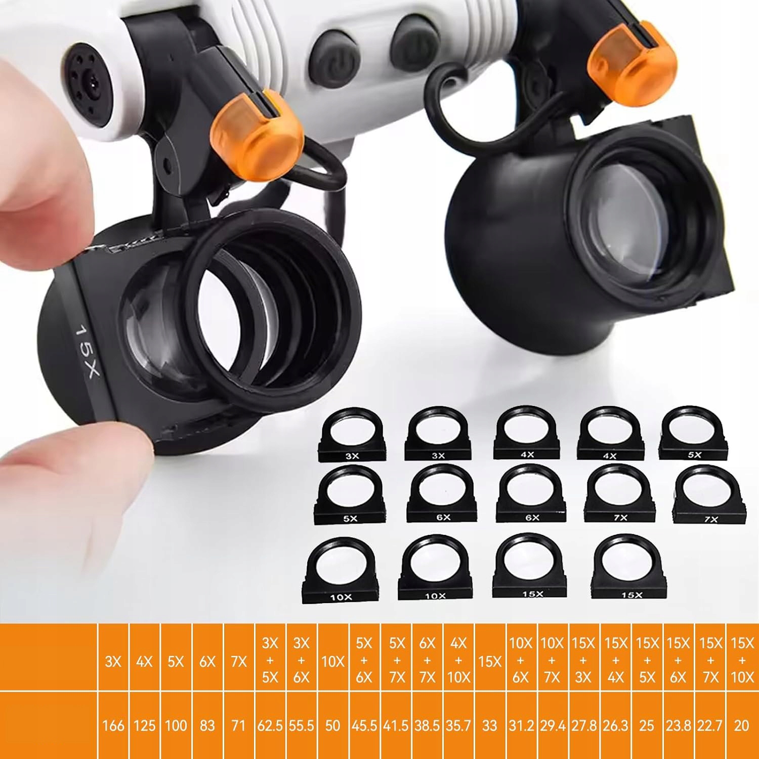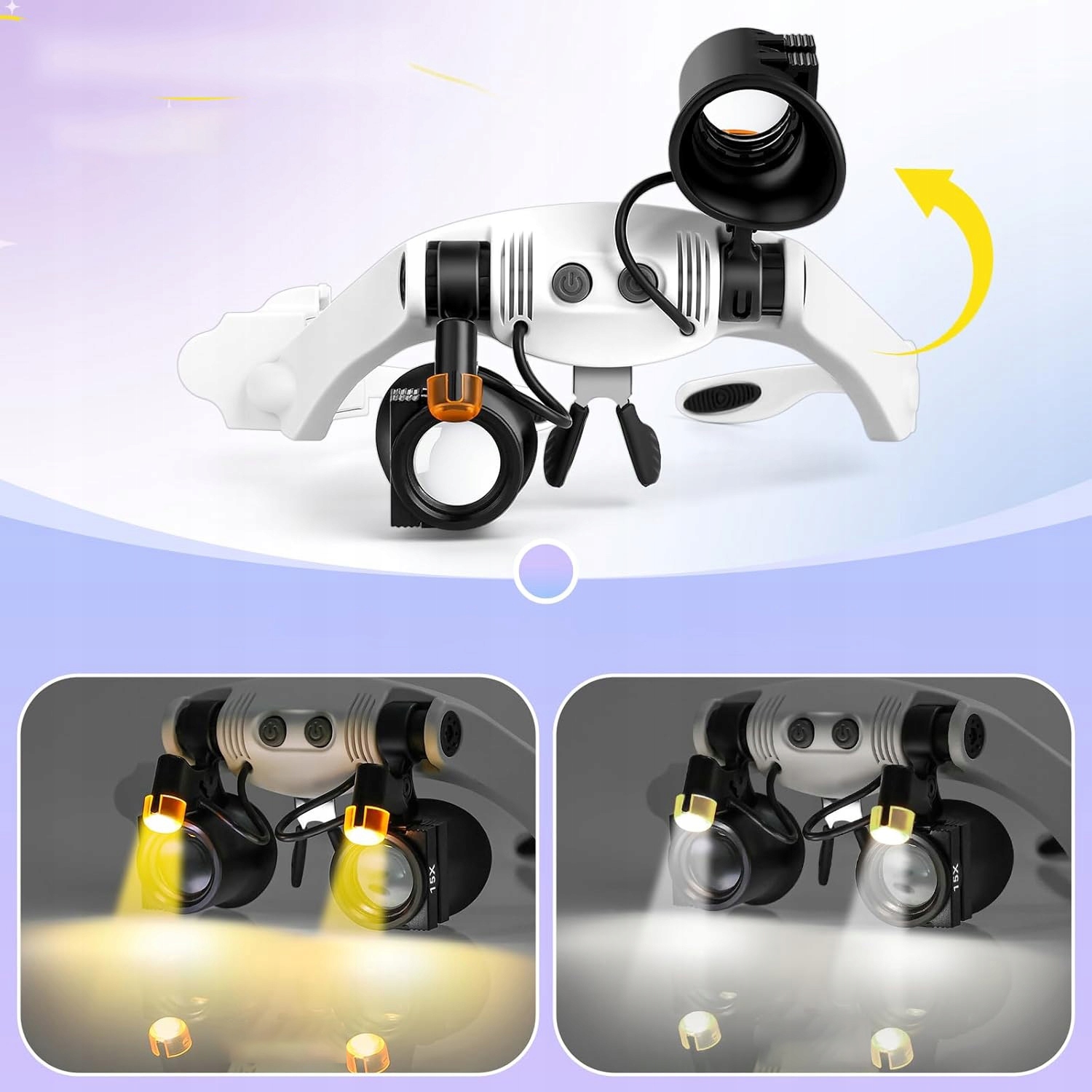 - с 2 светодиодами, 3 цветовых температур с регулировкой (тепло белый, плохо холодный белый, сильный холодный белый) и угол наклона могут быть свободно регулированы. Две линзы, которые позволяют настроить увеличение от 3 раза до 25x для каждого глаза, в зависимости от предпочтений.