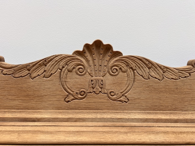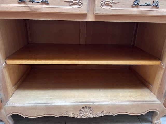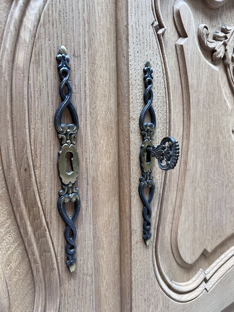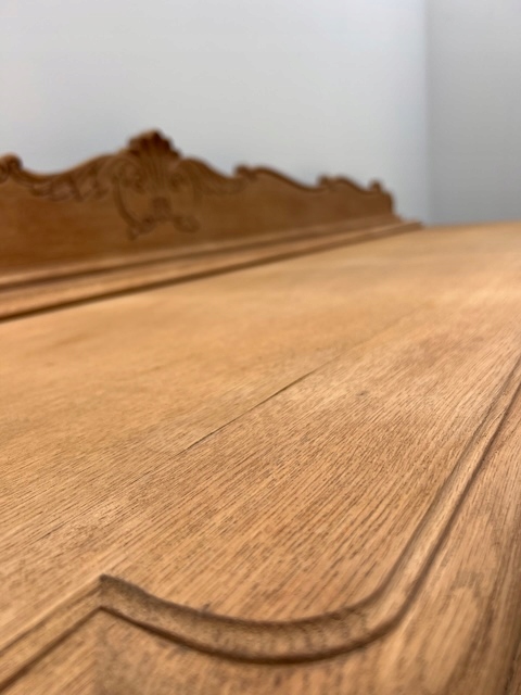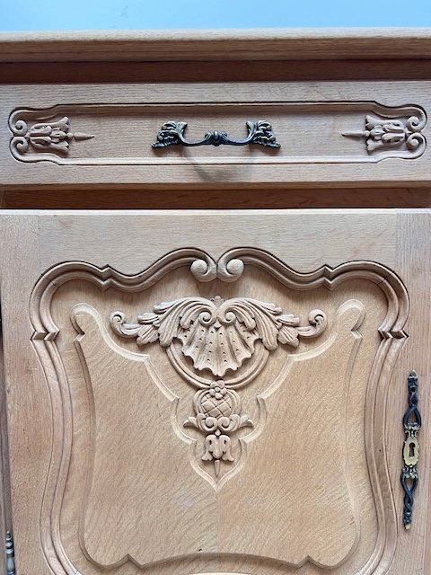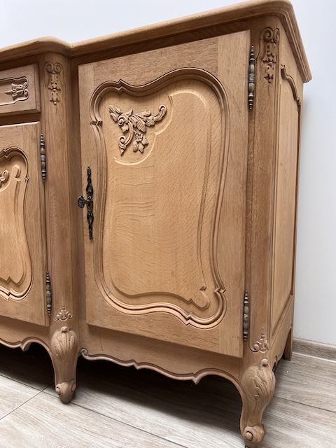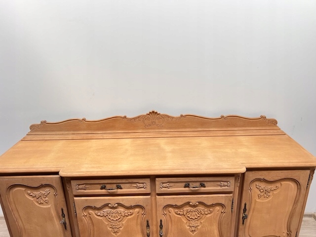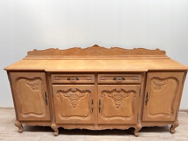 Дубовый комод выполнен в стиле Людвик. Очень хорошенькая. Очищен от внешних покрытий и профессионально подготовлен к покраске. Шпон на столешнице немного порван. Полки внутри не оригинальные. Других повреждений и дефектов нет. Замки функциональные, с набором ключей. Комод готов к дальнейшей работе.