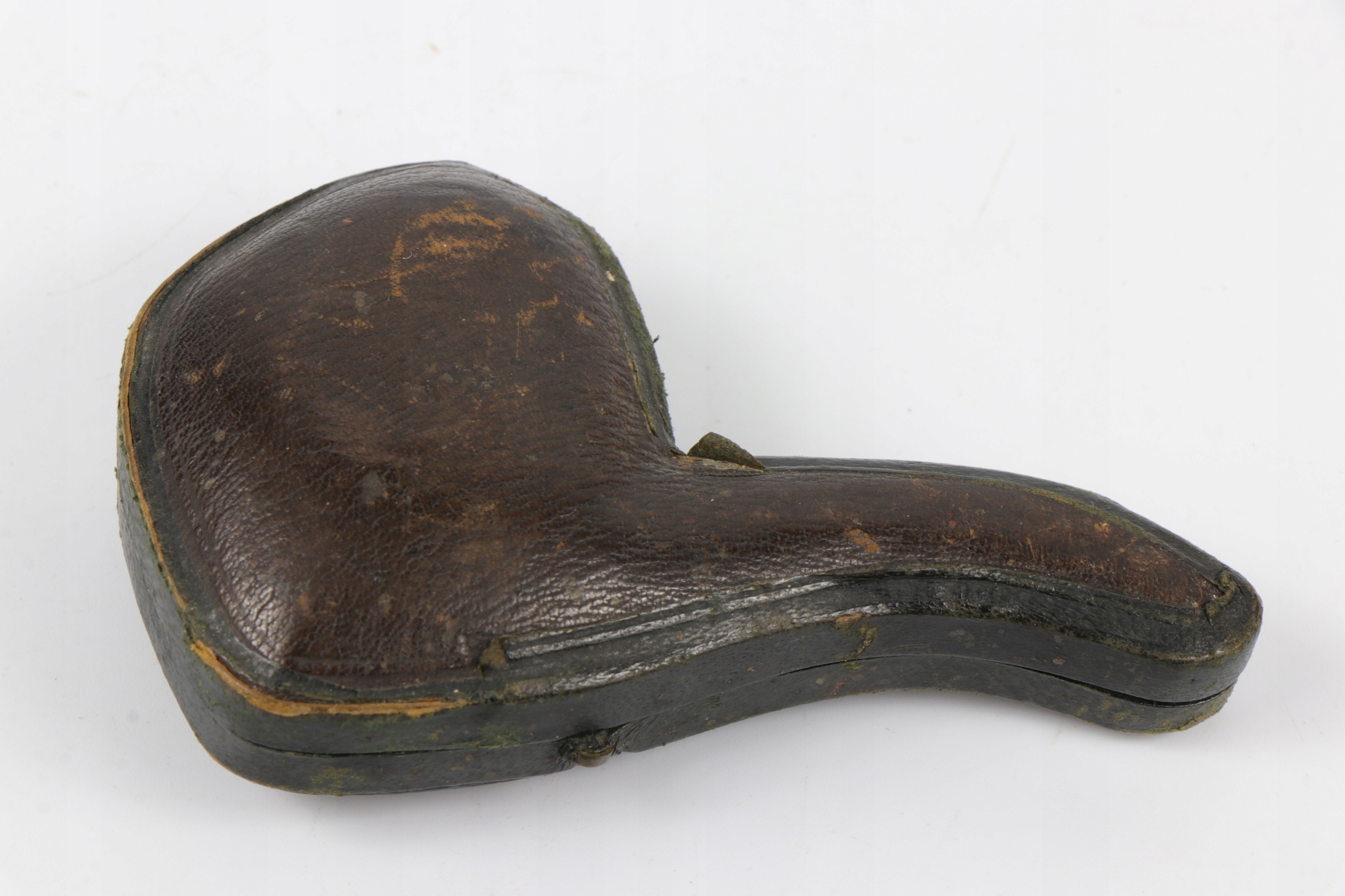Очень интересная коллекционная трубка для курения табака и, возможно, опиума в оригинальном футляре. Изготовлен из резной пенки, так называемой морской пены. Трубка в легкомысленном изображении головы зрелого мужчины в шляпе, держащего на плечах обнаженную женщину. Трубка второй половины XIX века. Маленькая трубка в футляре с логотипом производителя. Скульптура из природного камня сепиолита. Коробка картонная, внутри облицована бархатным материалом с подписью производителя K.L Au Pacha Montpellier.
