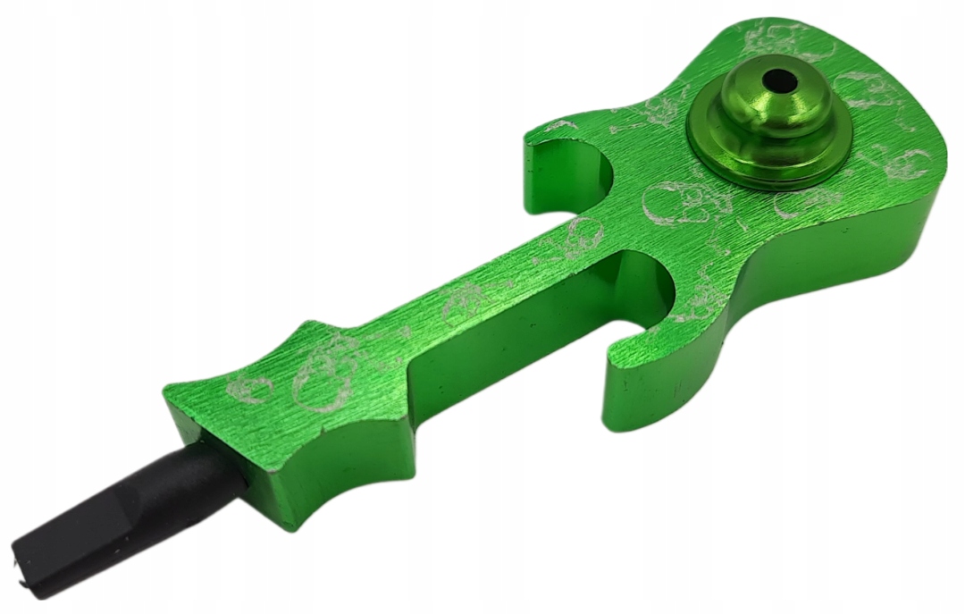 Предложение распространяется на практичную трубку в форме гитары, видную на фотографиях. Это металл. Мундштук резиновый и снимается. Чашу можно открутить. В комплект входят 5 дополнительных фильтров. Трубка маленькая и удобная, поэтому ее можно брать с собой куда угодно. Он легко поместится в вашем кармане. Размеры трубы 10,5х3х2 см.