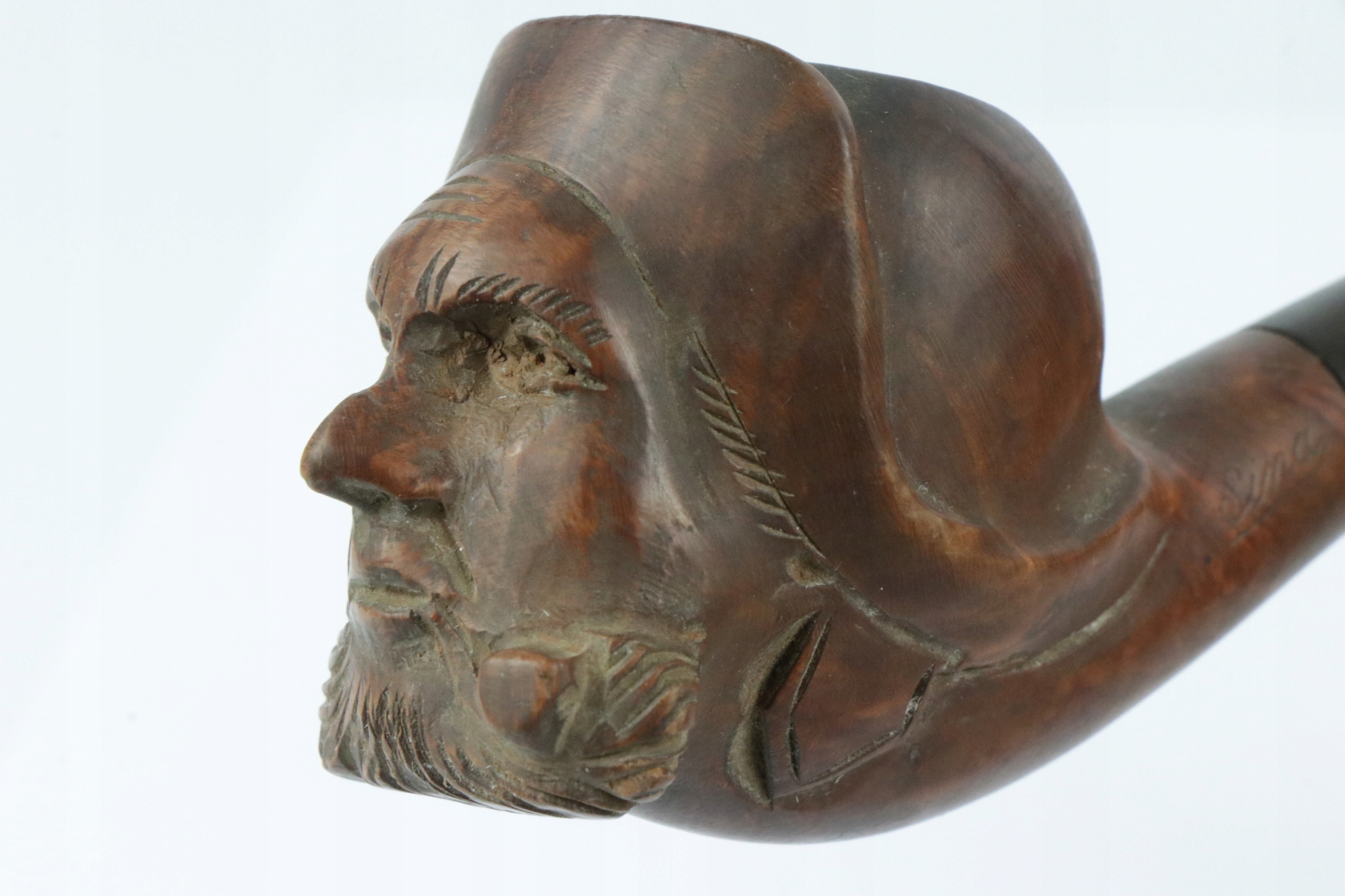 Очень интересная коллекционная трубка из дерева с резной головкой моряка-рыбака. Трубки с характерным профилем мундштука. На другой стороне трубка отмечена логотипом Sina под номером 402. Компания Sina работает с конца 19 века