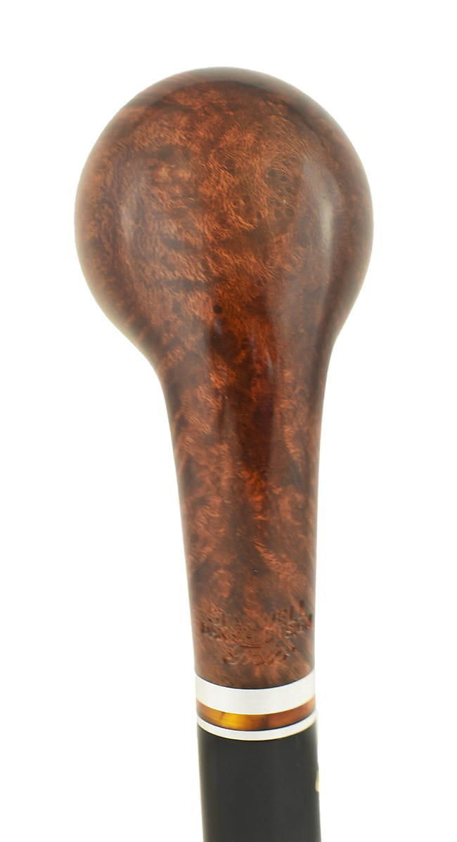 Головка трубки с теплым коричневым оттенком, выполненная из бриара, впечатляет гладкостью и видимой структурой древесины, подчеркнутой более светлыми отблесками. Двойное серебряное кольцо в сочетании с янтарной вставкой создает необыкновенно шикарный акцент между шеей и мундштуком.