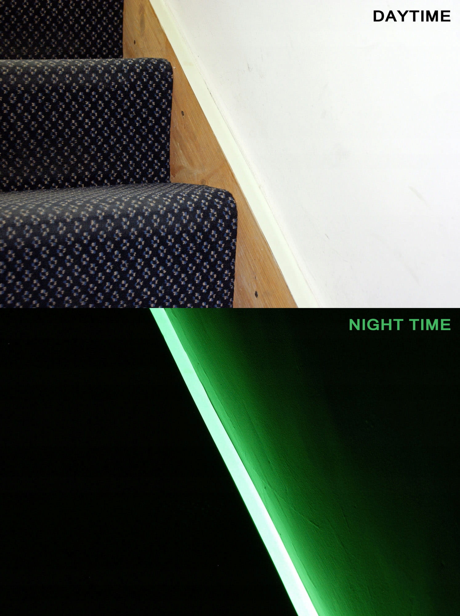Фотолюминесцентная лента состоит из стандартной самоклеящейся пластиковой пленки-основы, пропитанной фотолюминесцентным порошком. Материал «заряжается» от естественного или искусственного освещения, когда освещение тускнеет, изделие сразу начинает излучать яркий свет.