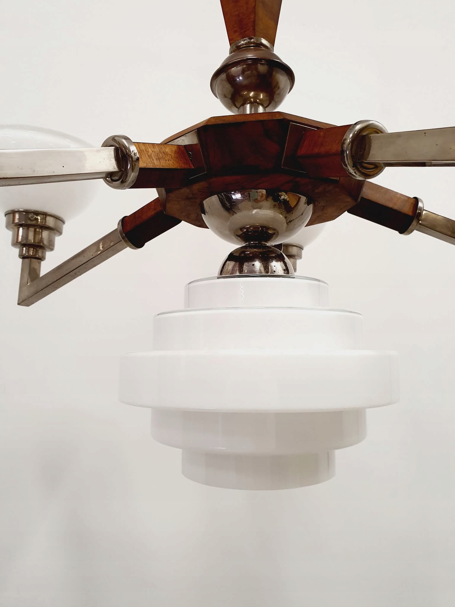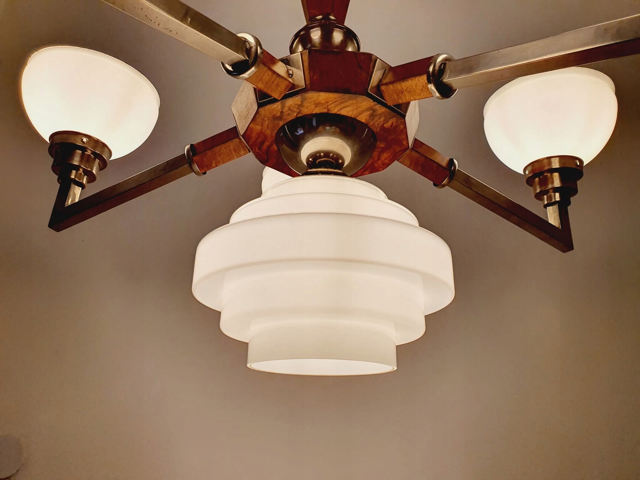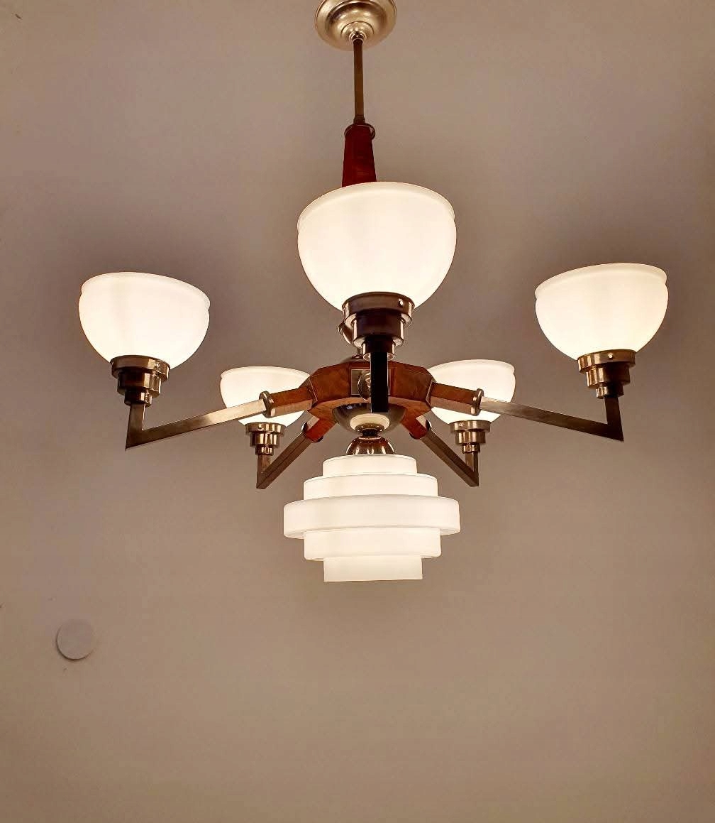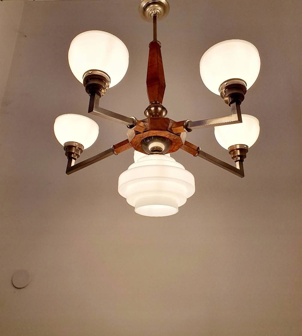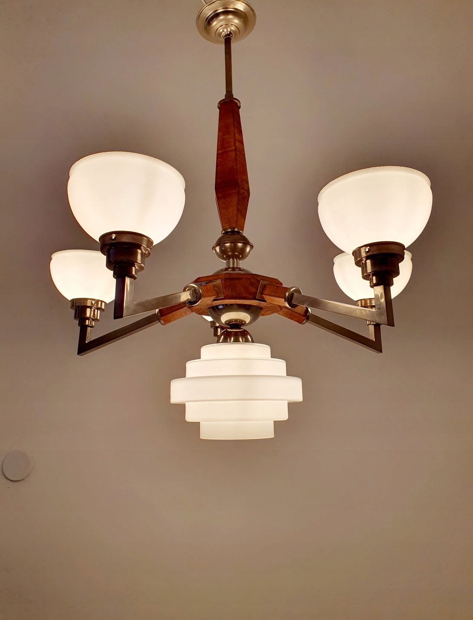 люстра была снесена в первые части, никелевые элементы, дерево после ремонта. Электрик полностью заменил новым (конечно, разделен на цепи вверх/ вниз).