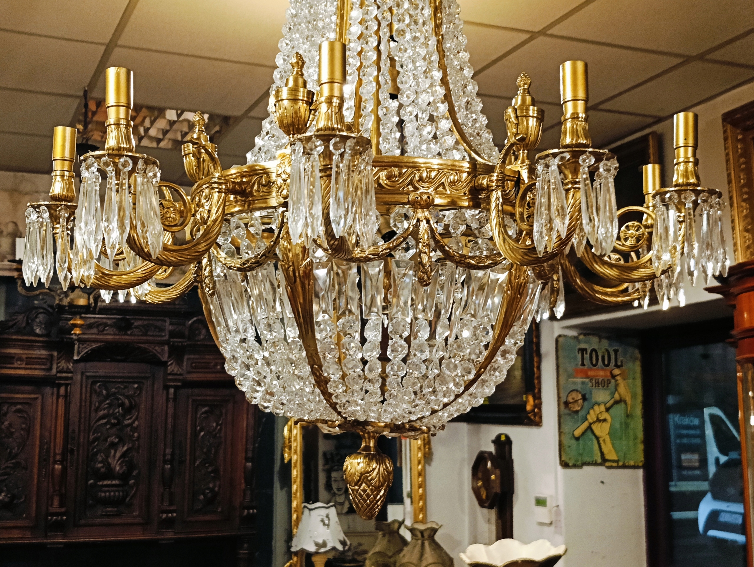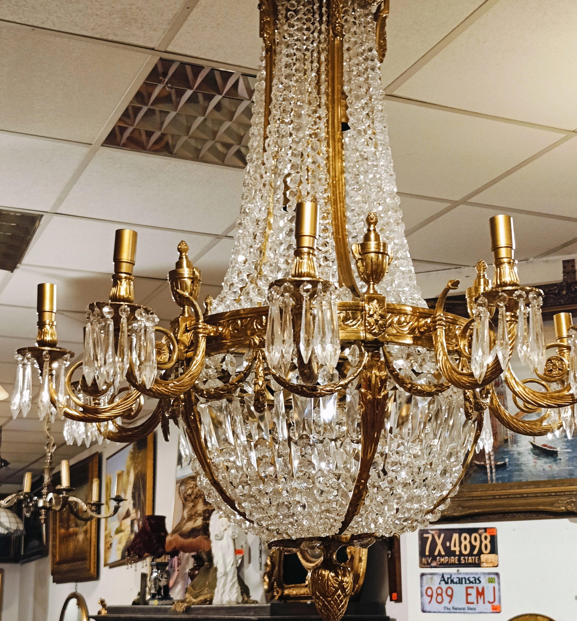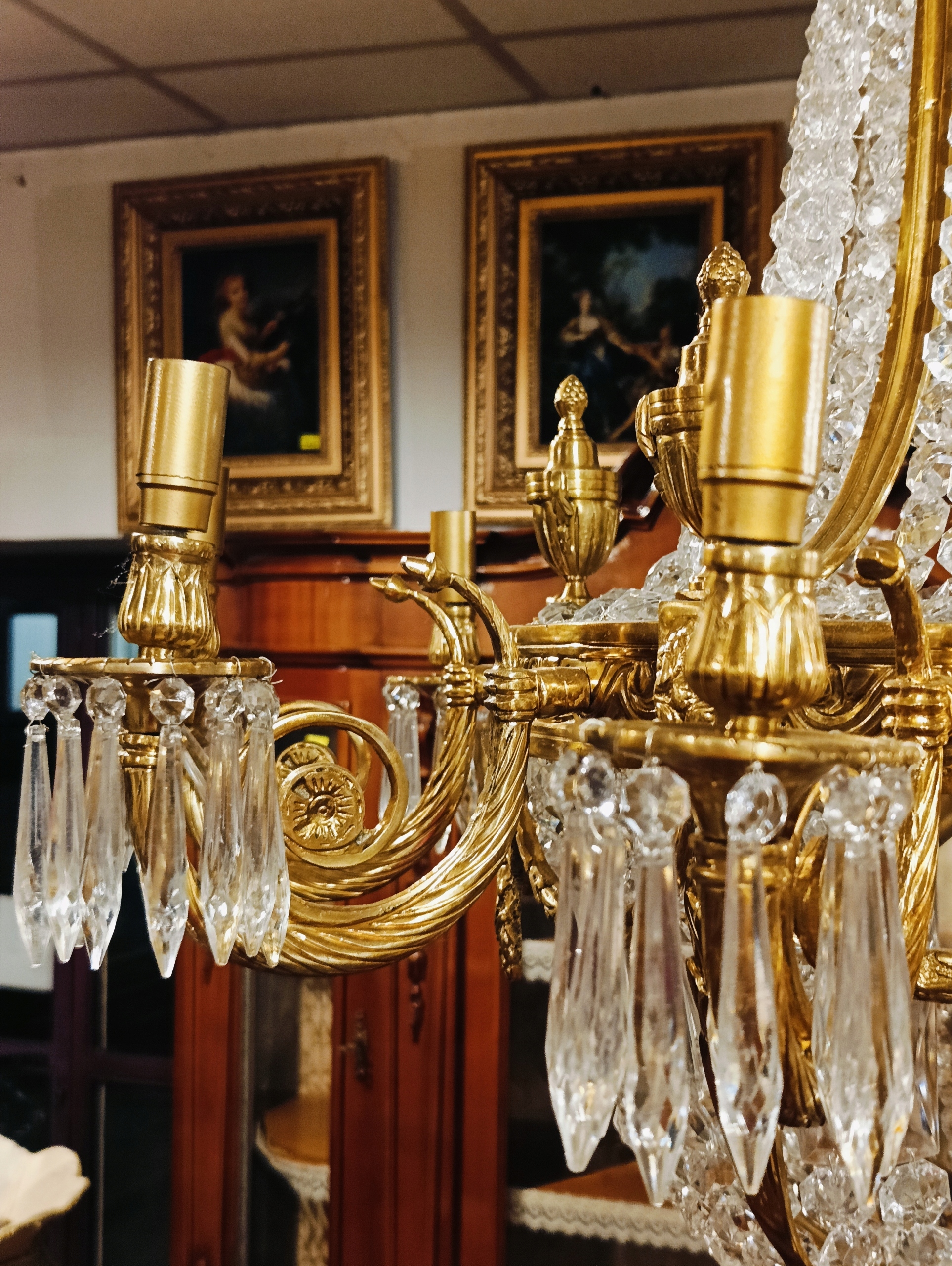 Очень декоративная и привлекательная лампа, созданная так, чтобы выглядеть старинной и исторической. Сделано современно; был импортирован из Франции. Он представляет собой сочетание латуни и стекла, которое рассеивает преломленные световые лучи, в результате чего получается очень яркий и приятный для глаз свет. Дополнительным декоративным элементом являются свет и тени, отбрасываемые на потолок при так называемом паутинка.