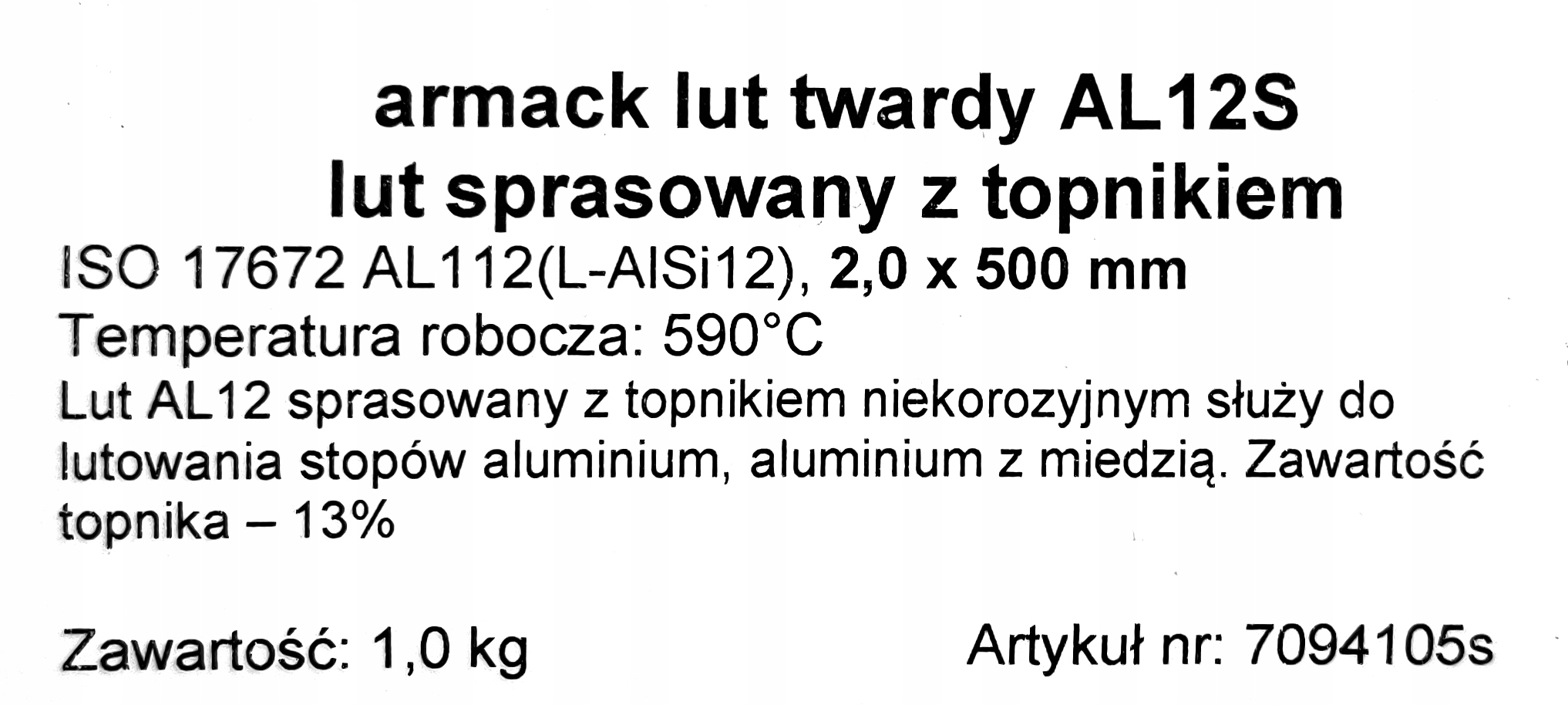 Спрессованный твердый припой с флюсом согласно DIN EN 1044-Al104 (L-AlSi12), диапазон температур плавления 570-585°C. Спрессованное связующее (гомогенное) с некоррозионным флюсом (DIN EN 1045 FL20), содержание которого составляет 13%. Припой предназначен для пайки алюминия с алюминием (при содержании МГ в сплаве ≤ 3%) и алюминия с медью. Содержание флюса исключает необходимость использования дополнительного флюса. Припой используется в автомобильной промышленности и в сфере отопления, вентиляции и кондиционирования воздуха. Идеально подходит для ремонта автомобильных систем кондиционирования. Этот сплав можно использовать для соединения алюминия с хромоникелевой сталью. Использование АЛ12 снижает вероятность образования горячих трещин.