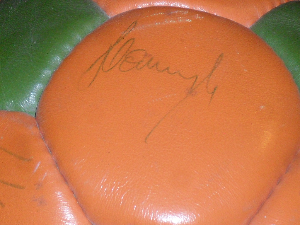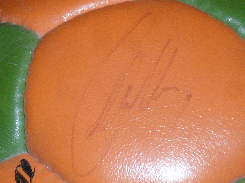 Оригинальный шар, подписи сделаны фломастерами, поэтому немного выцвели, но все равно отлично читаются. Мяч находится в наших руках уже 44 года. Насколько я знаю, таких шаров было очень мало и наш, наверное, один из немногих, кто уцелел.