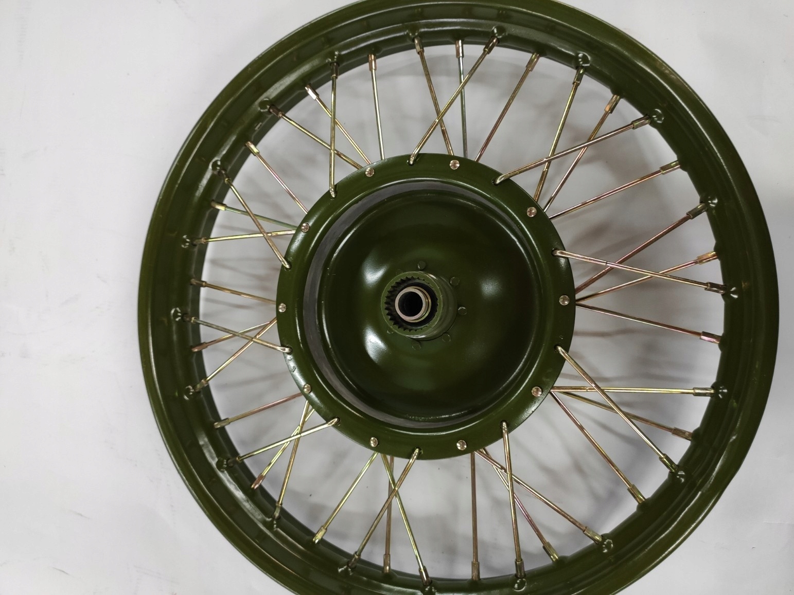 Новое, полное колесо для M-72, готово к сборке. Колесо с зеленым ободом и концентратором (окрашенная порошка) и оцинкованные спицы.