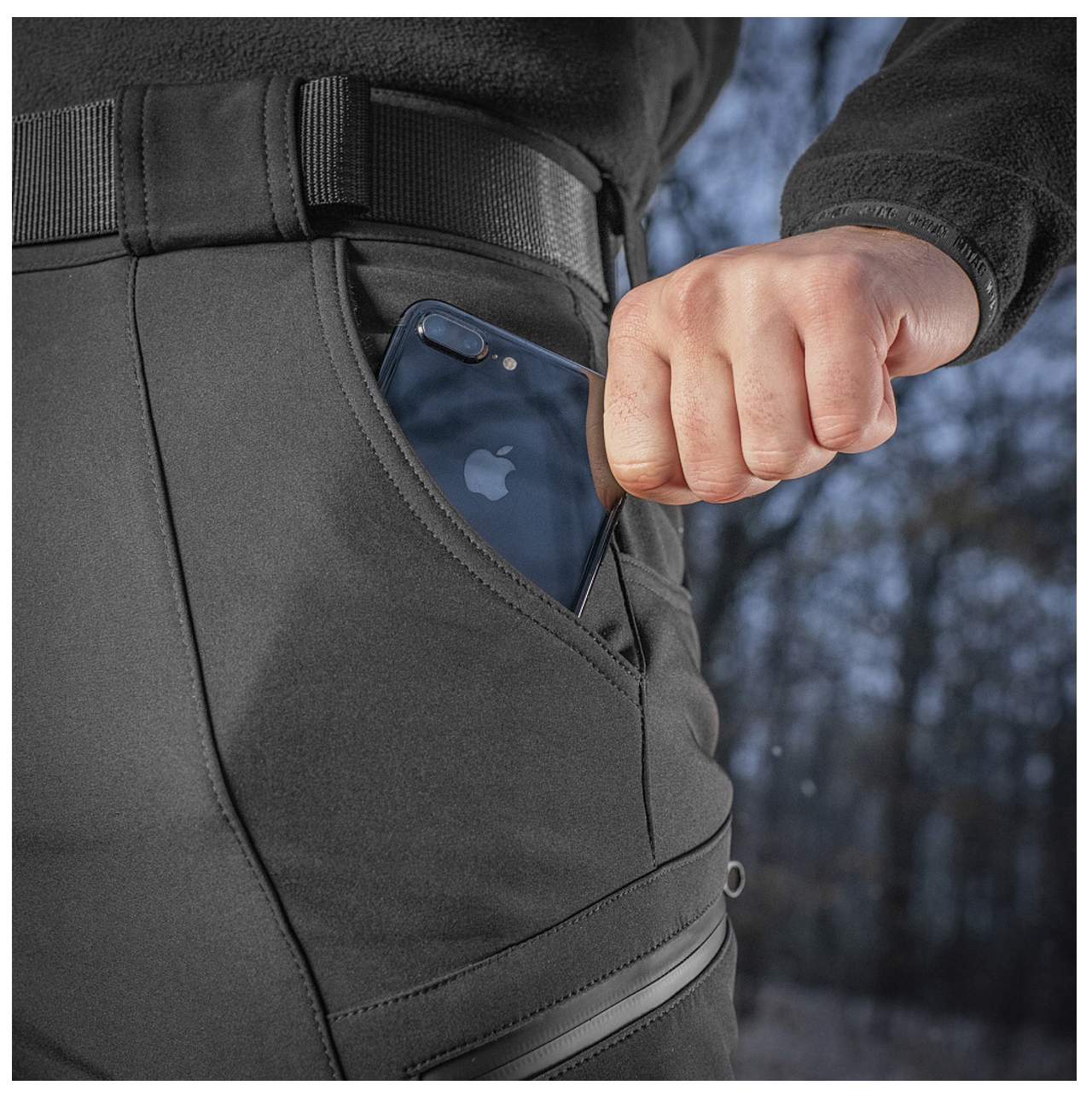ВНИМАНИЕ! Предметом предложения являются зимние брюки Softshell черного цвета. Остальные элементы (например, телефон, обувь, толстовка, ремень) используются для визуализации функциональности.