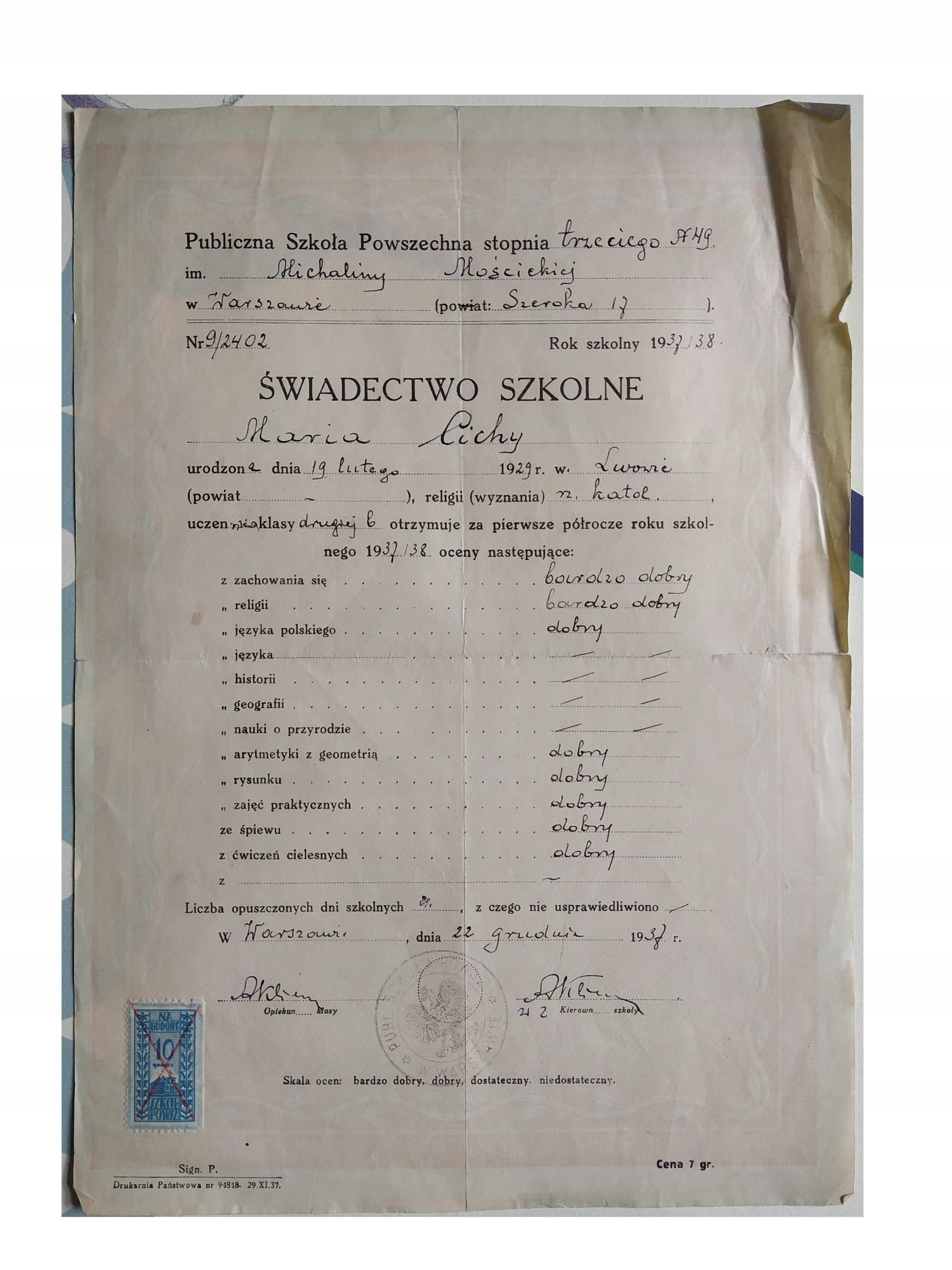 М. М. МОЩИЦЬКОЇ ПОЧАТКОВОЇ ШКОЛИ ВАРШАВА - СВІДЧЕННЯ