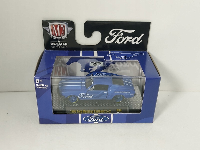 Ford Mustang Fastback 2+2, синяя модель 1968 года от M2 Machines в масштабе 1:64, серия Detroit Muscle 64, новинка