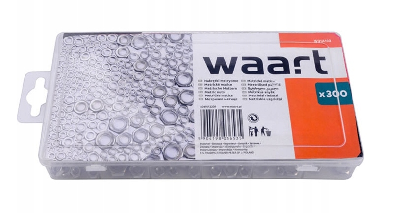 Набор из 300 кусочков стальных колпачков в разных размерах. Набор включает в себя самые популярные размеры, используемые в растениях и мастерских. Набор, помещенный в кассету, закрытую с защелками с печи, чтобы повесить на крючок, например, в мастерской. Каждый размер имеет отдельный отсек в коллективном пакете, который мешает вам смешивать во время транспорта.