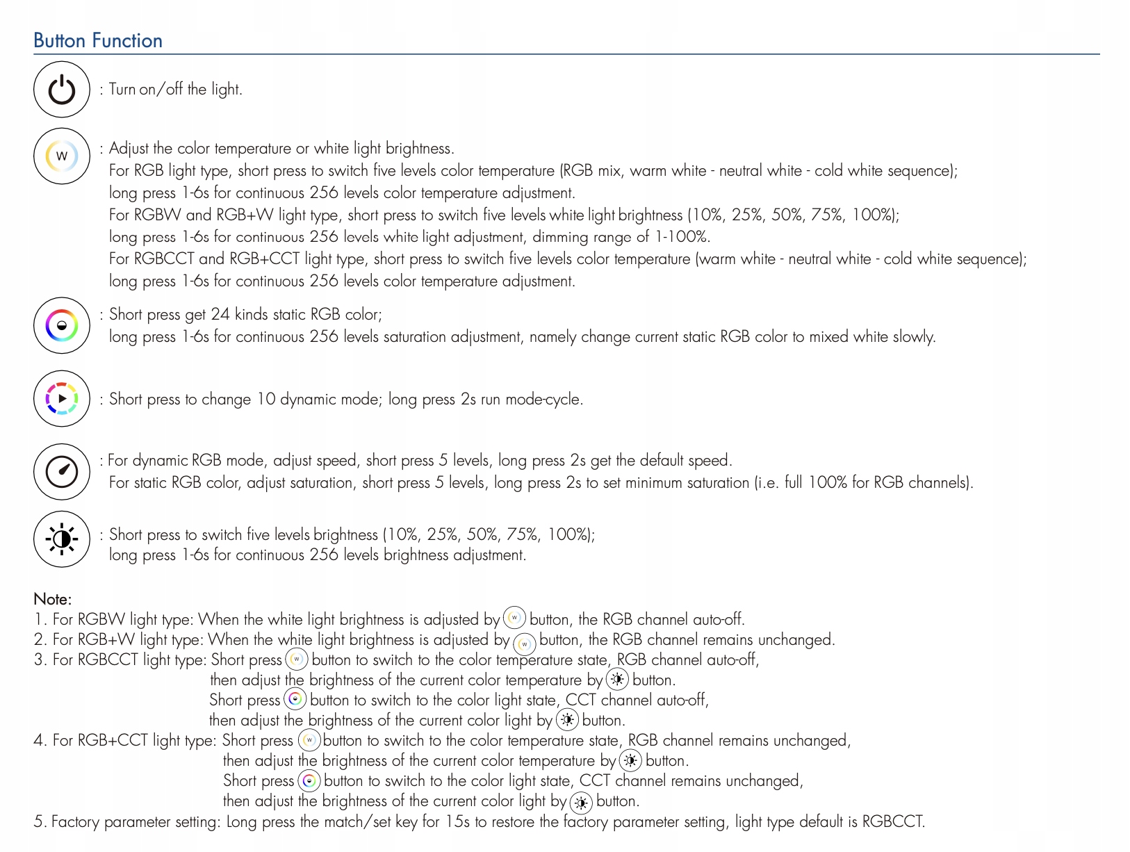 Светодиод радиоконтроллера m5 (Вторник) используется для управления интенсивностью света, излучаемой с помощью RGB/RGBW/RGBCCT/RGB+CCT светодиодная полоса. Функции для переключения/выключения, яркости, цветовой температуры и цветов RGB, а также изменений в динамических режимах и скоростях