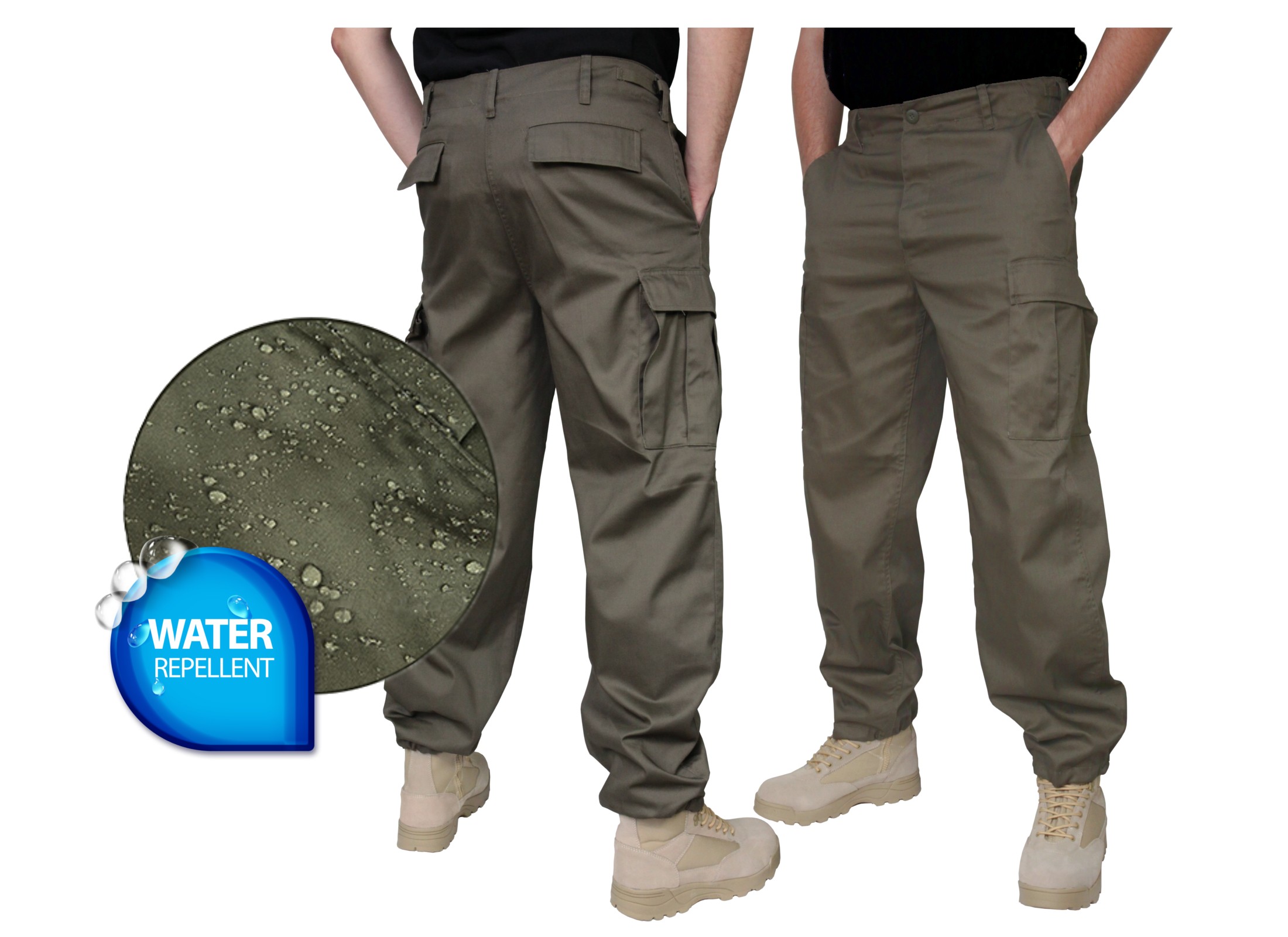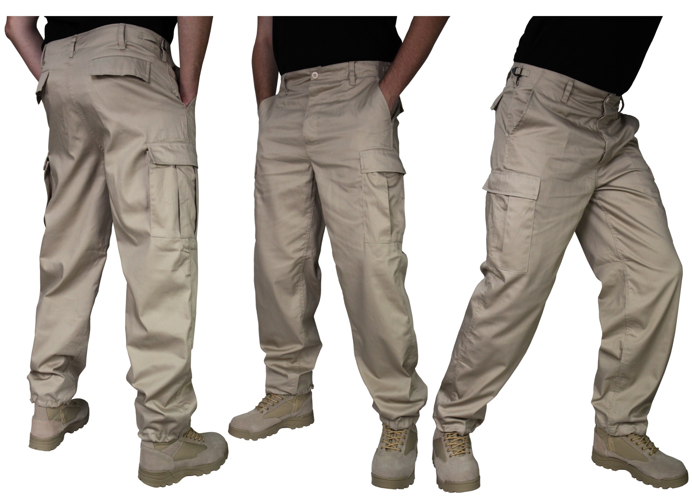 - у них 6 карманов, 2 спереди, 2 сзади, 2 транспортных кармана типа CARGO на бедрах. Брюки и карманы застегиваются на пуговицы