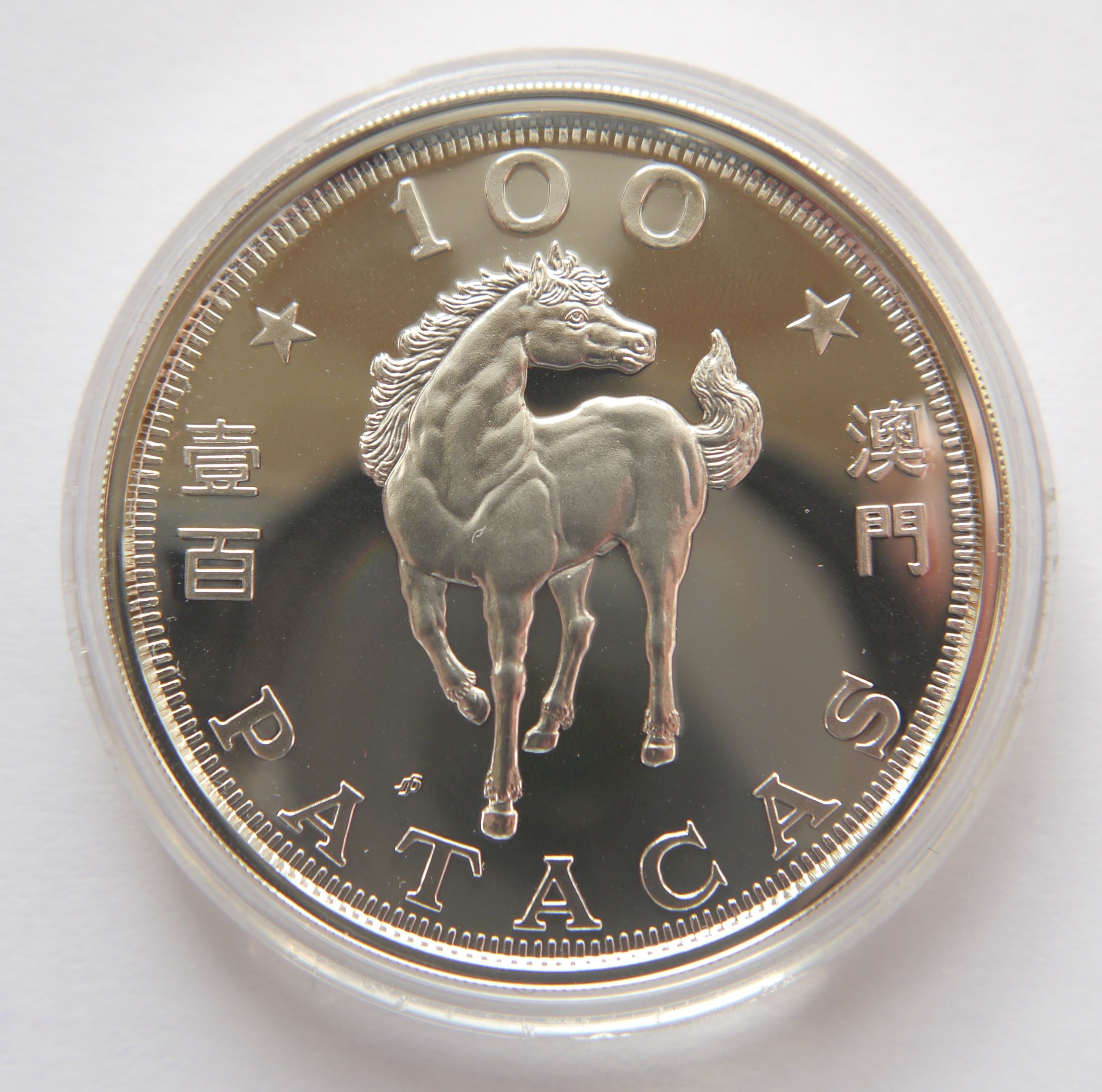 M7/ MACAU 100 PATACAS 1990 PROOF ROK KONIA SREBRO