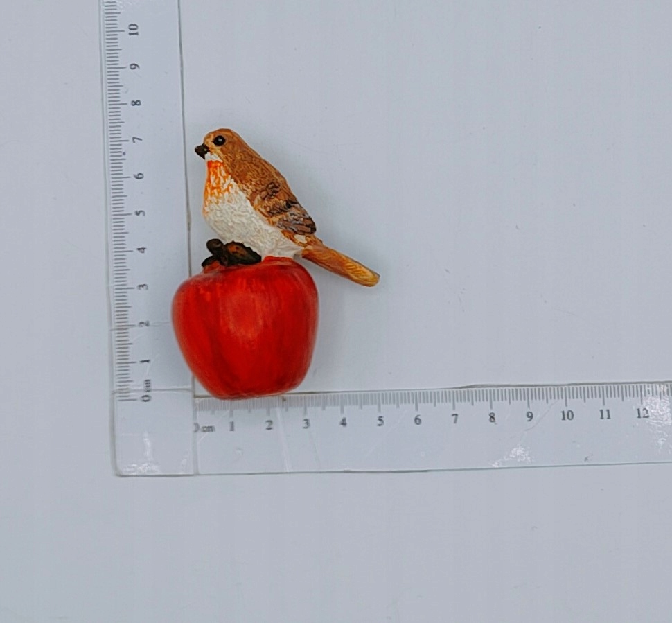 mała figurka, kolorowy ptak siedzący na jabłuszku