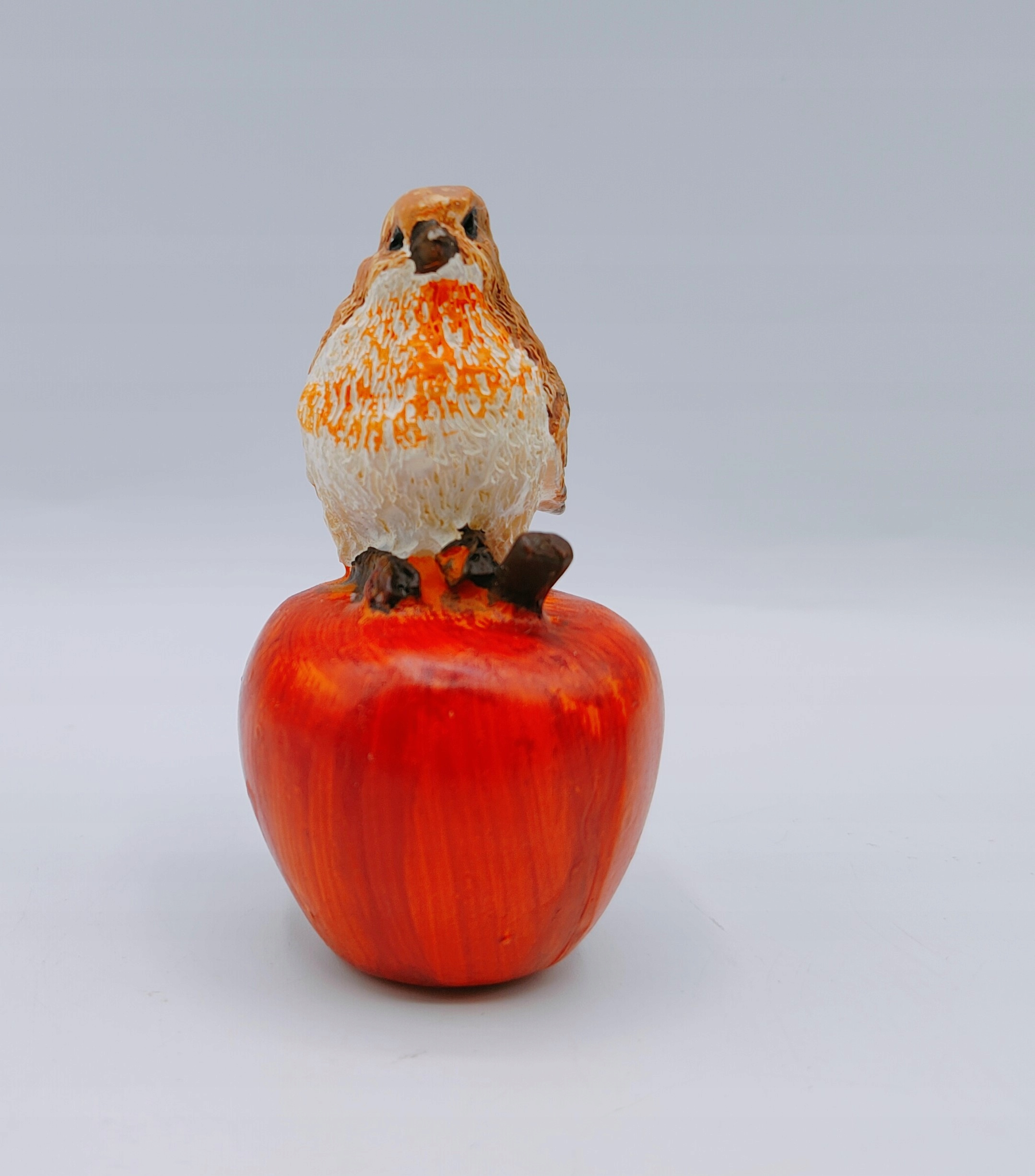 маленькая фигурка, разноцветная птичка, сидящая на красном яблоке