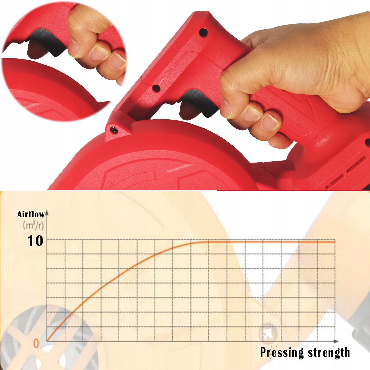Направление воздушного потока 230 км/ч позволяет эффективно работать без необходимости наклоняться. Скорость ветра ветряной мельницы: 20000 об/мин; Производительность: 10 м³/мин.
