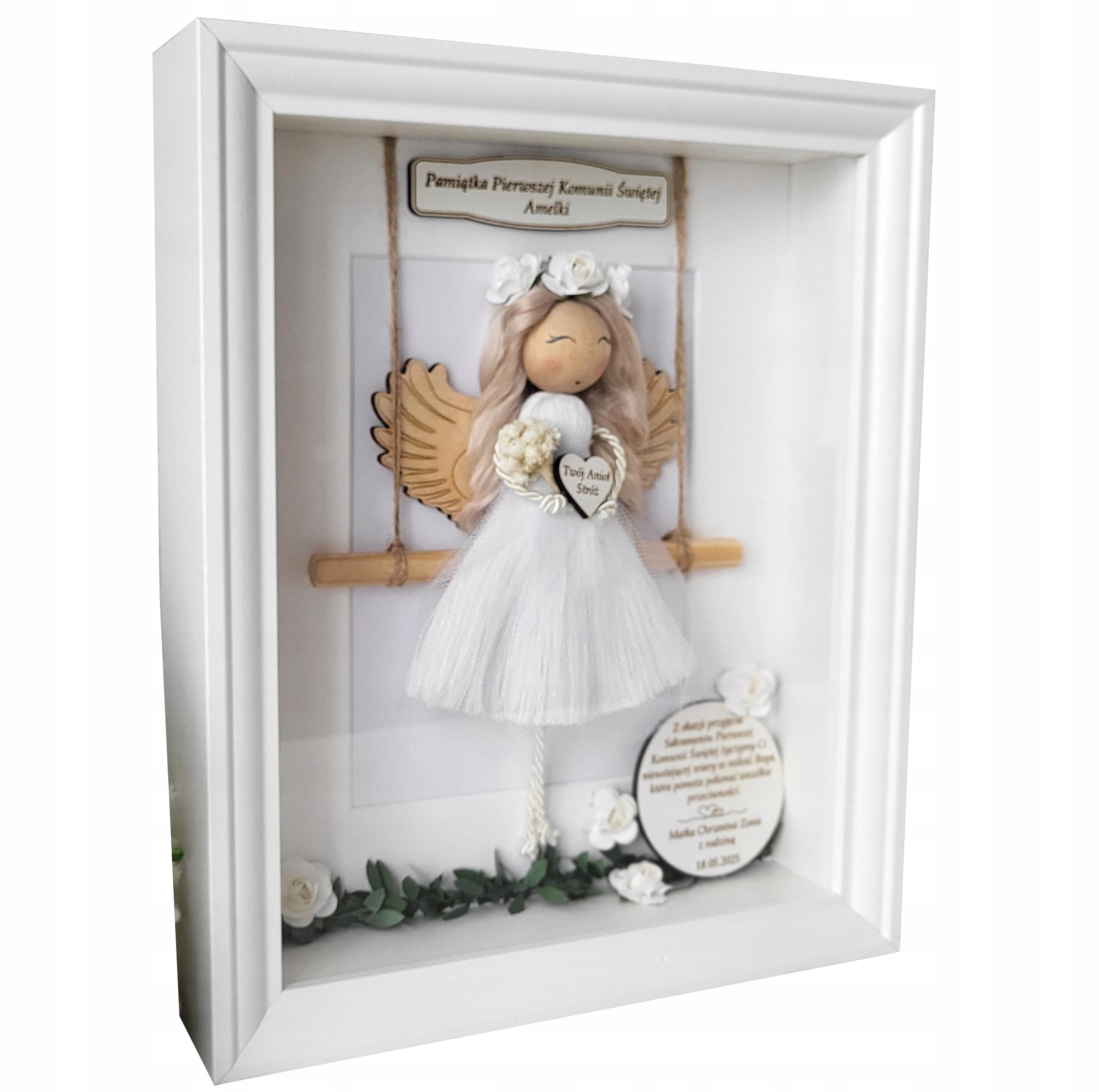 красивый ангел из метода макрома в рамке для быстрого горшка. Это оригинальное дополнение к любому интерьеру. Это также может быть красивым украшением для девочки и комнаты мальчика. Это также будет работать в подарок, например, для крещения, причастия, дни рождения и других случаев. Белая глубокая рамка, покрытая плексами, благодаря тому, что вы не пылите и выглядите элегантно!