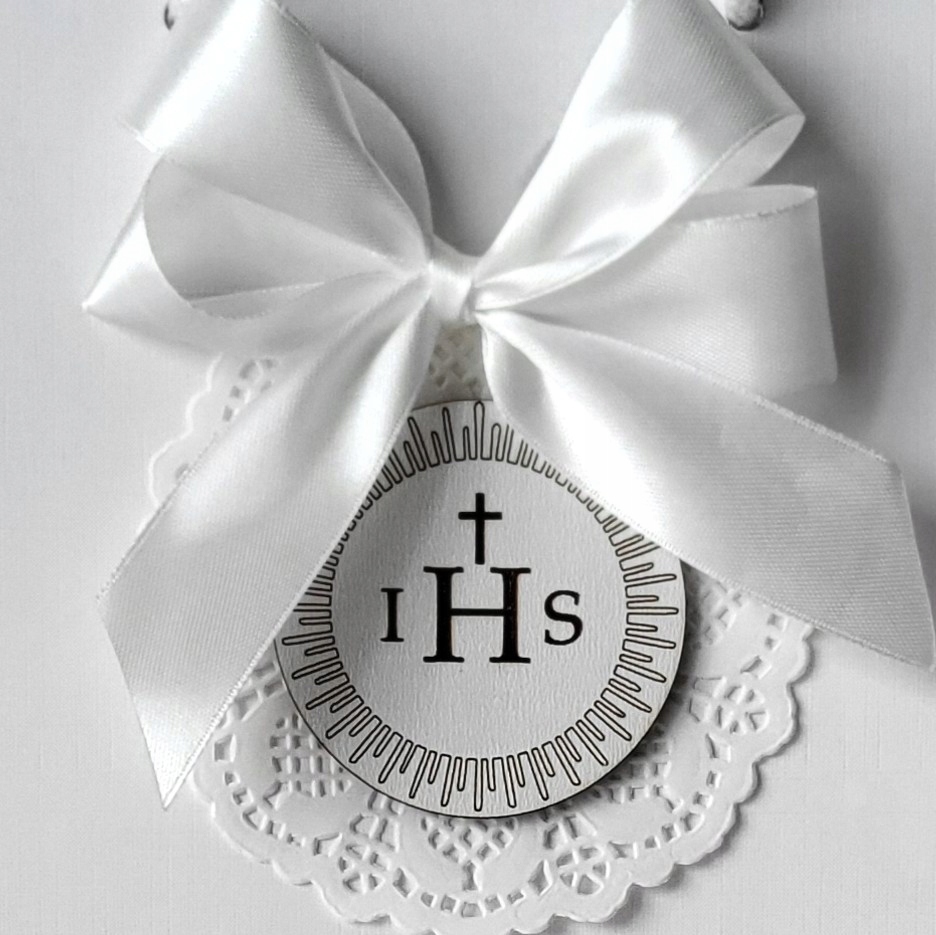✅ На передней части сумки есть гравированный символ IHS на белом HDF 3 мм, а над ним - красивый белый лук, он идеально соответствует причастии или крещению.