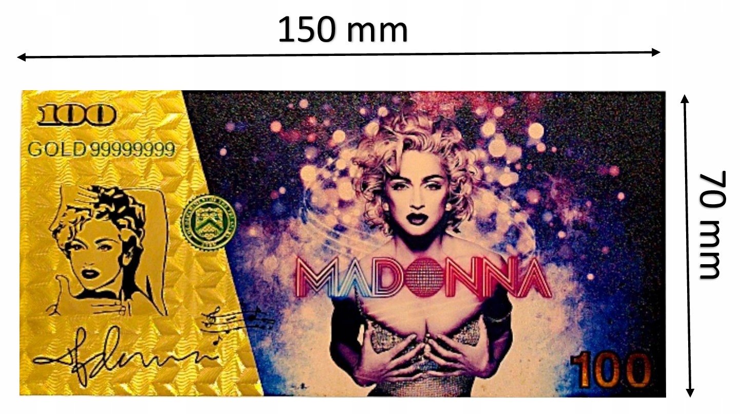 Эта необычная коллекционная банкнота — настоящая находка для всех поклонников Мадонны и любителей нумизматики. Золотая отделка добавляет элегантности и престижа, а изображение музыкальной иконы делает ее необыкновенным украшением любой коллекции.