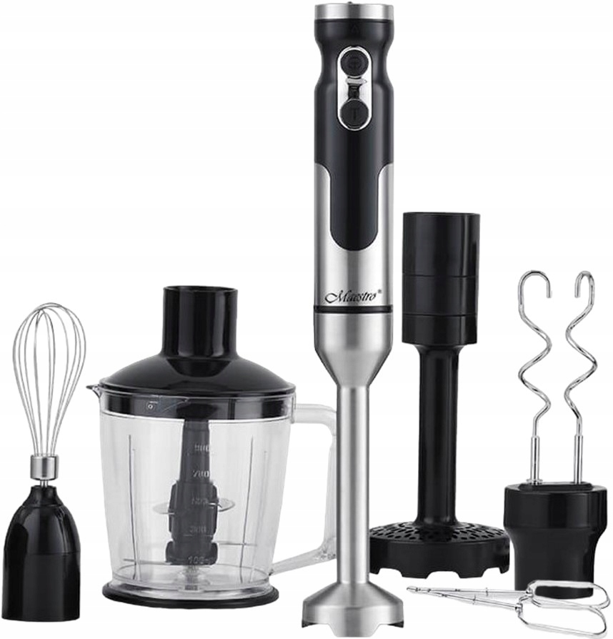 Кроме того, набор включает в себя наконечник для взбивания картофеля и венчу, который идеально подходит для приготовления пушистой пены или легкого торта. повара. Наслаждайтесь удобством и эффективностью при приготовлении ваших любимых блюд с полным набором Maestro Hand Blender 1000 Вт.