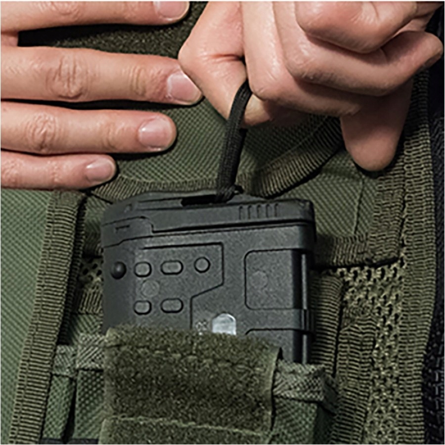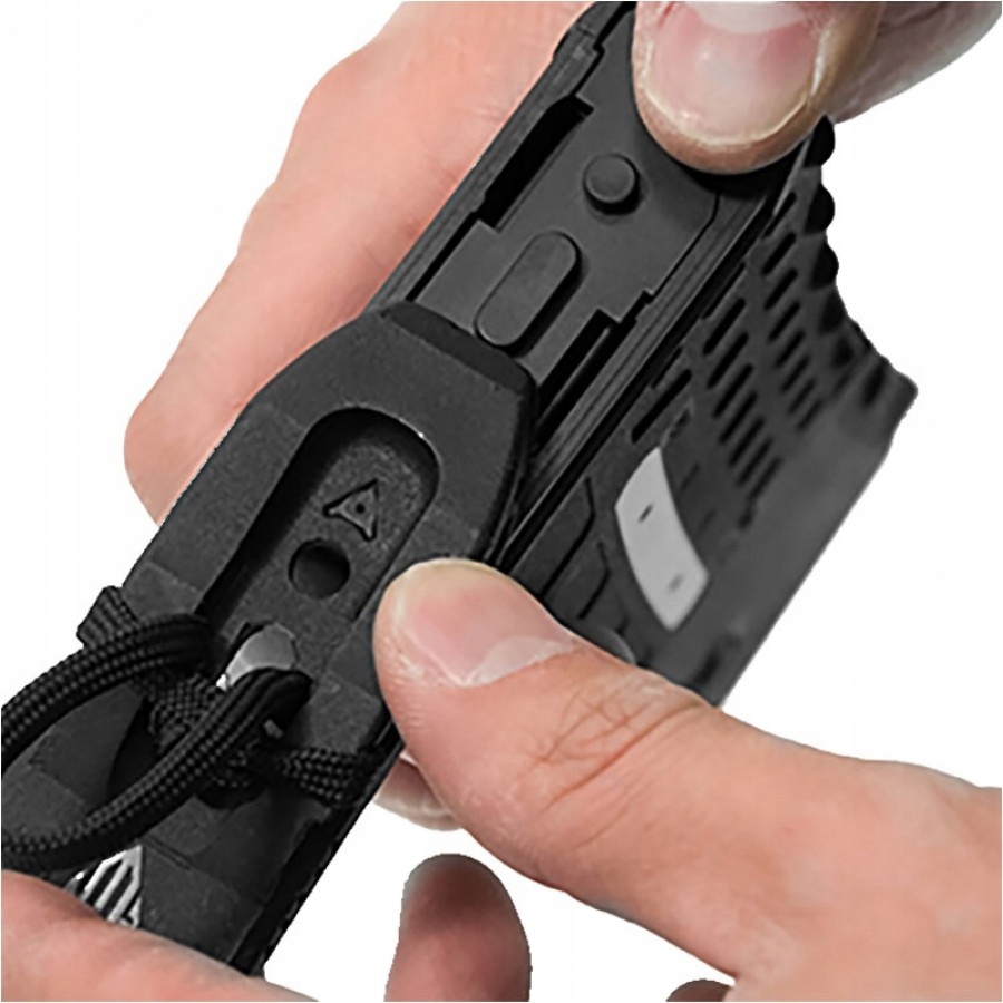 Специальный упор, расположенный чуть выше ножки, облегчает вытягивание и предотвращает слишком глубокое вставление магазина в подсумок. Кроме того, противоскользящие ножи на стенках облегчают манипулирование магазином. Благодаря отверстиям в ножке к магазину можно прикрепить импровизированные ручки из паракорда, что позволит более эффективно и быстро вытаскивать его из подсумка.