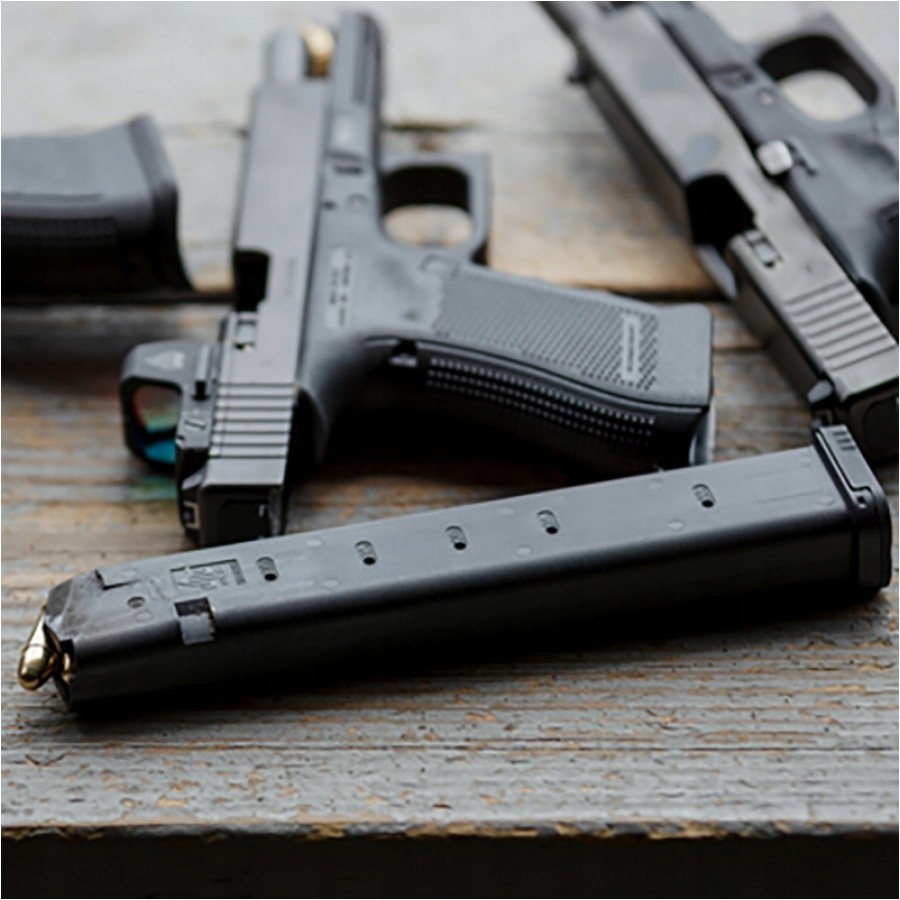 Журнал Leapers для пистолетов Glock 9 × 19 мм с емкостью до 33 пуль сочетает в себе качество, долговечность и надежность с умеренной ценой. Благодаря этому он популярен среди гражданских и униформных стрелков.