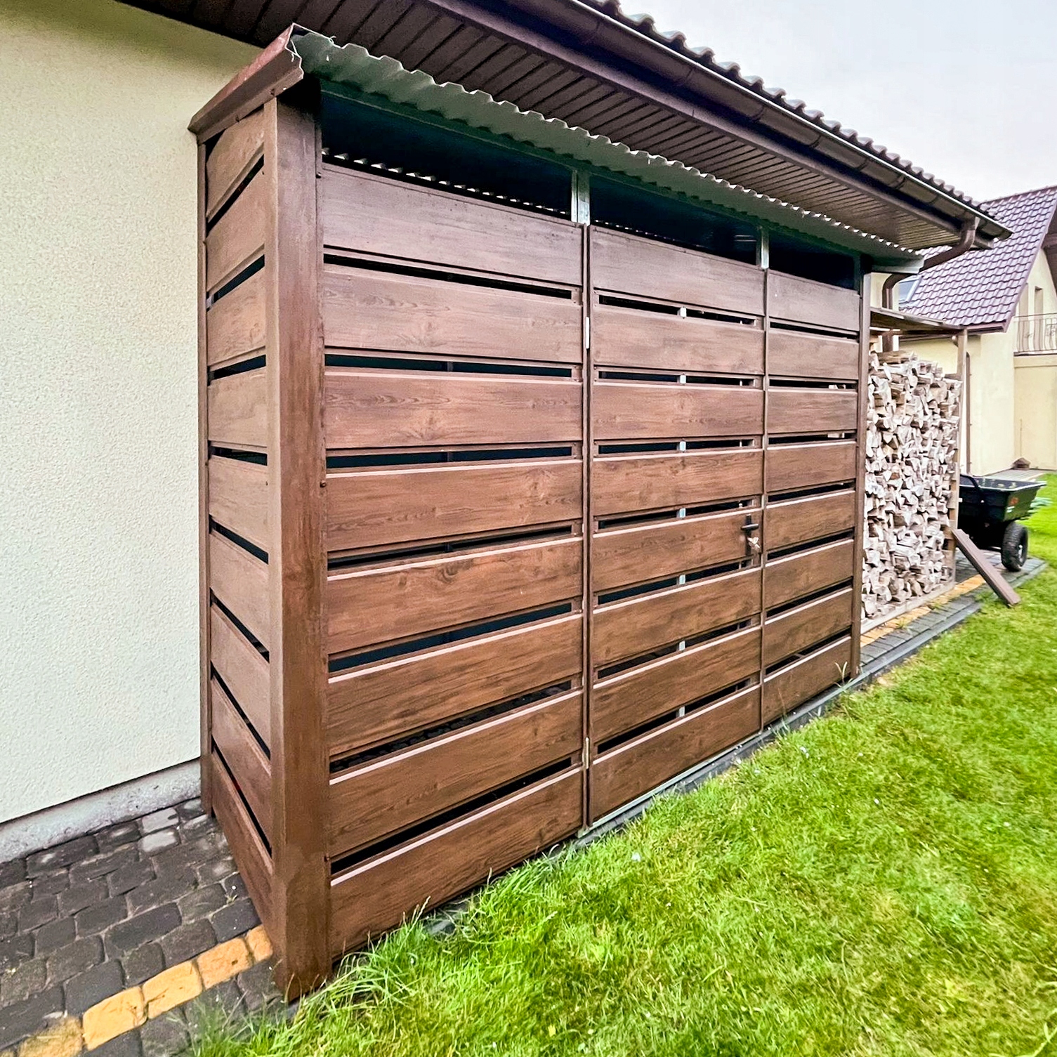 ХРАНИЛИЩЕ ДЛЯ МУСОРА - 3X0,8M - ПОСТРОЕНО С ПАНЕЛЯМИ - ДВЕРИ - ТЕМНЫЙ ОРЕХ - ПОДХОДЯЩЕЕ ДЕРЕВО - ПЕРЕДНЯЯ СКАННАЯ КРЫША TS893