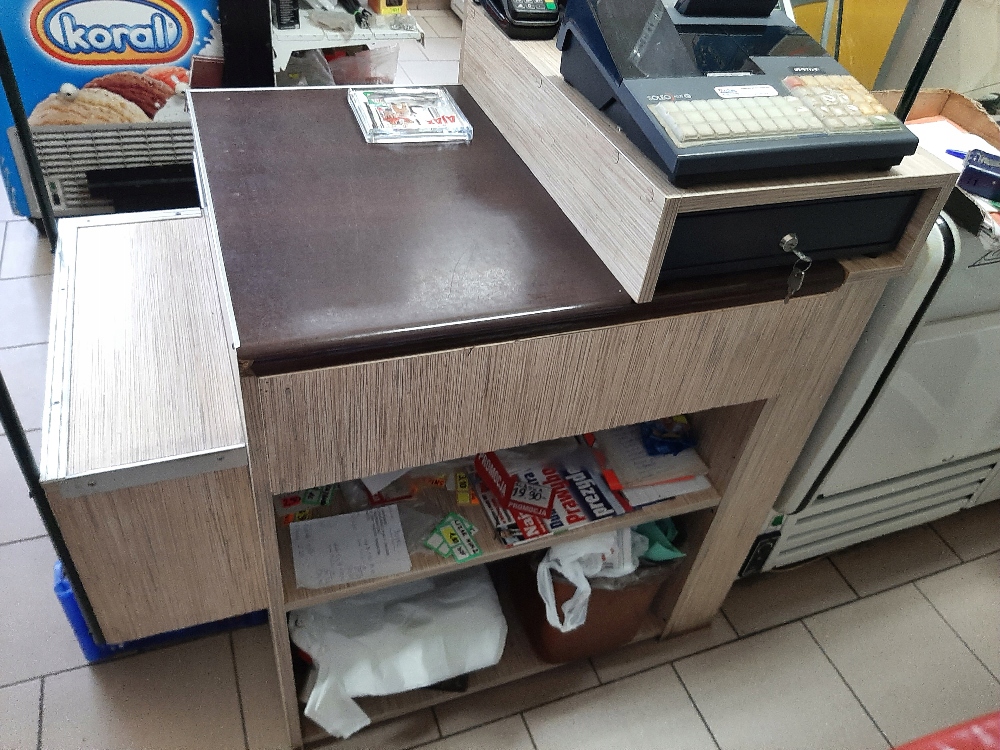 Я продам компактный счетчик магазина с ящиком и полками. У Лада есть особые места для веса, денег и ящика. Существует также платежный терминал. Zboku имеет сильную полку для корзины и на передней части сумки для клиента. Алюминиевые полоски. Сделано из ламинированной пластины, специально для заказа для удовлетворения всех потребностей. Рамка была привинчена к даме