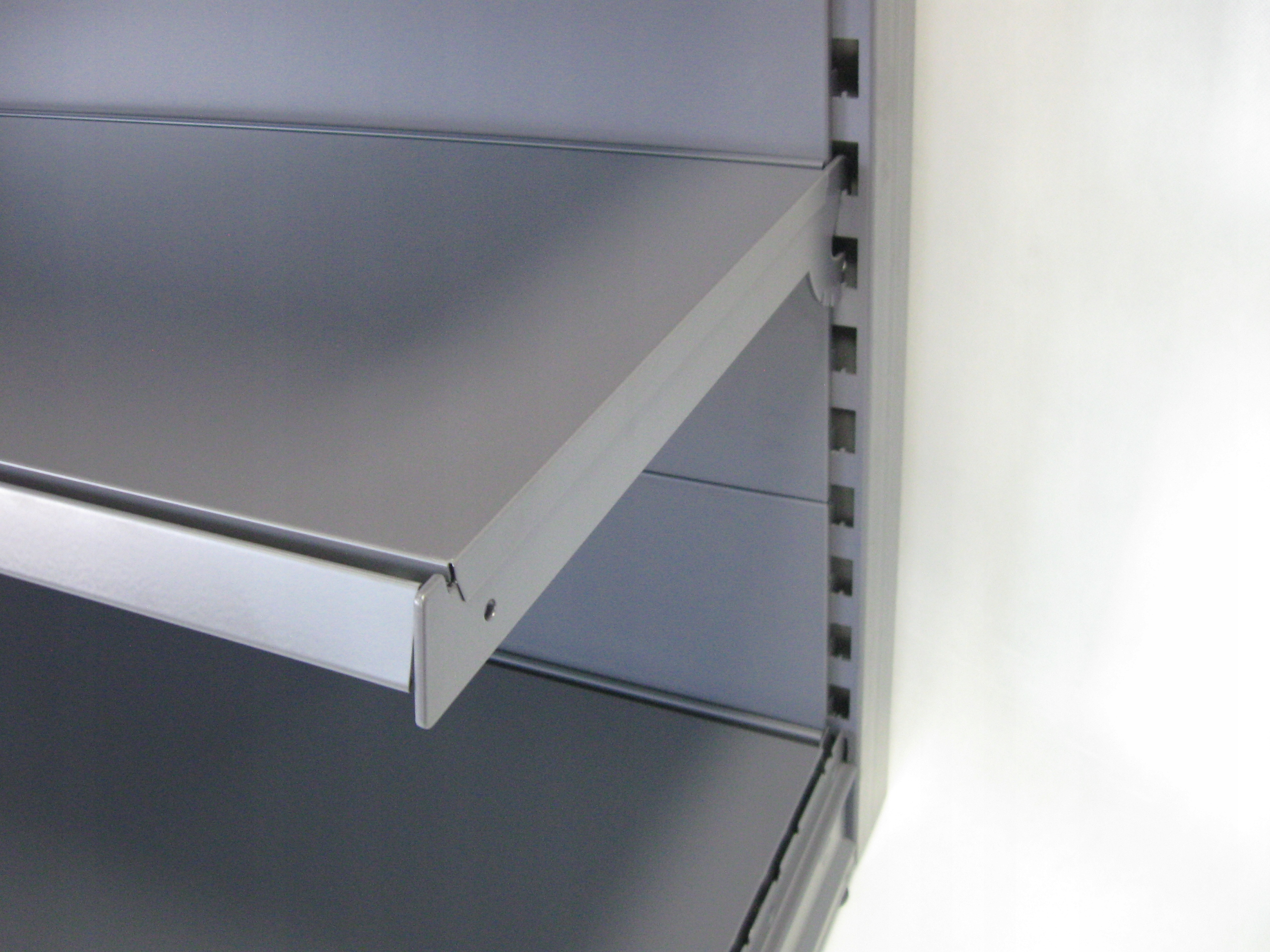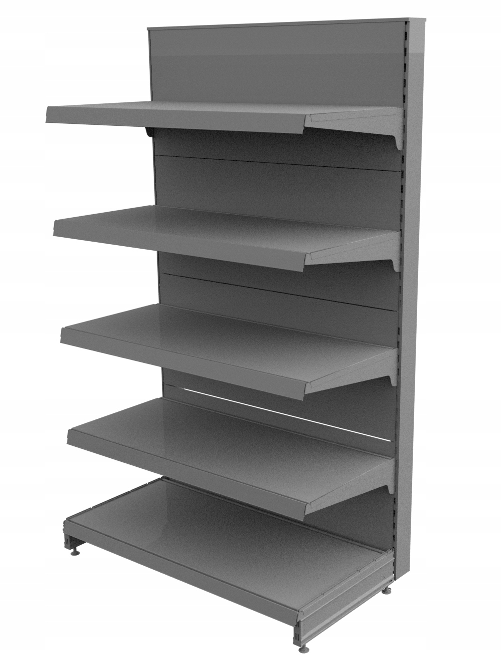 Полка торговая металлическая, односторонняя, торцевая (для установки на верхнюю часть полки-гондолы), полностью изготовлена из высококачественных профилей и металлических листов, покрыта порошковой краской. Каждая полка имеет структурное усиление и может подвешиваться горизонтально или под двумя разными углами. Высота подвешивания полок градуирована каждые 5 см.
