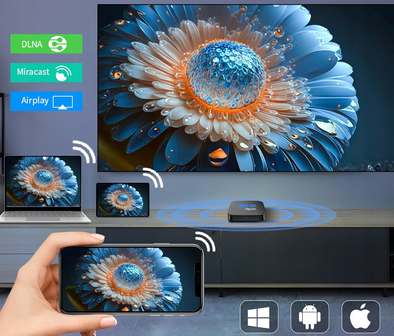 4 ГБ ОЗУ + 64 ГБ ПЗУ: ТВ-бокс поставляется с возможностью обновления до 4 ГБ/64 ГБ с помощью быстрой флэш-памяти. Память также можно свободно расширить с помощью дополнительного жесткого диска на 1 ТБ, SD-карты на 128 ГБ и TF-карты на 128 ГБ. OTA (технология загрузки по беспроводной сети), которая автоматически загружает пакеты обновлений и автоматически обновляет их по сети.