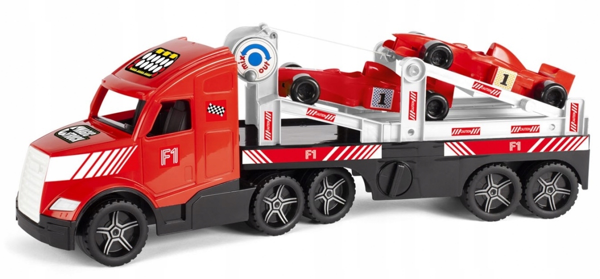 Magic Truck Action с Формулой 1 - отличная игрушка для самых молодых энтузиастов и автомобильных гонок. Он имеет съемный, крутой полузащитник с 2 гоночными автомобилями Формулы 1. Полуотборщик может быть прикреплен к кабине двумя способами. Кроме того, полупрерывальщик оснащен выдвижными опорными ногами, которые могут стать постоянным трейлером. Автомобиль сделан из материалов, безопасных для детей. Большим преимуществом является долговечность и сила структуры, что означает, что игрушка может обслуживать детей в течение многих лет.