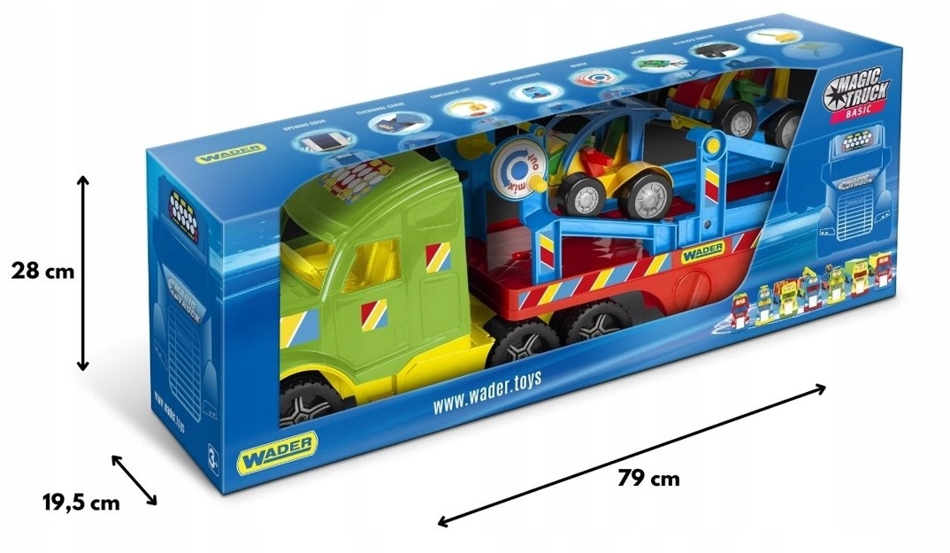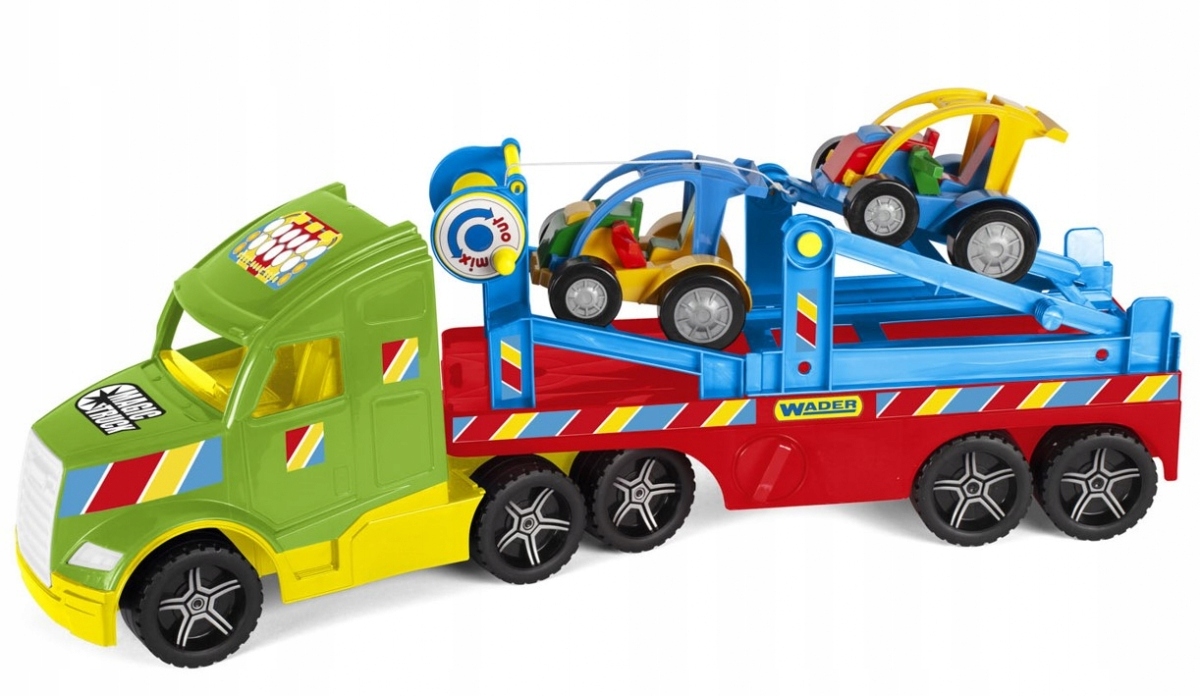 Magic Truck Basic Buggy автомобили - отличный подарок для самого молодого очарования песчаной пустыни. Реалистично воспроизводит настоящий автомобиль - он оснащен вторжениями и лебедкой, благодаря какой багги машины втянуты в эвакуатор. Полу -перевод может быть прикреплен к кабине двумя способами, благодаря которой автомобиль может достигать длины 110 см. Кроме того, он имеет выдвижные ножки опорных опор, которые могут стать постоянным трейлером.