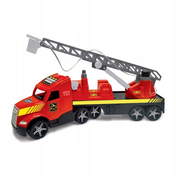 Пожарная часть красного цвета с желтыми вставками. В передней части автомобиля установлены люминесцентные фонари, благодаря которым при попадании света фары автомобиля светятся в темноте. На крыше кабины имеются светоотражающие наклейки. Грузовик со съемным прицепом. Установите регулировку длины. Ограждение оснащено выдвижной вращающейся лестницей и шлангом, разбрызгивающим воду.