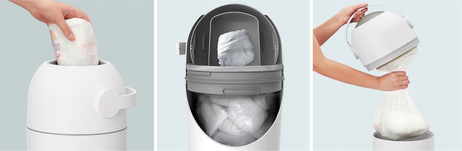 емкость корзины составляет 40 л (около 25 подгузников) достаточно на несколько дней, и ее можно легко опорожнить, не выпустив какое -либо запах, накопленное в корзине, оба после вставки подгузника в корзину и при опустошении. Дополнительным преимуществом является возможность использования стандартных пластиковых пакетов для мусора, без покупки специальных, дорогих картриджей.