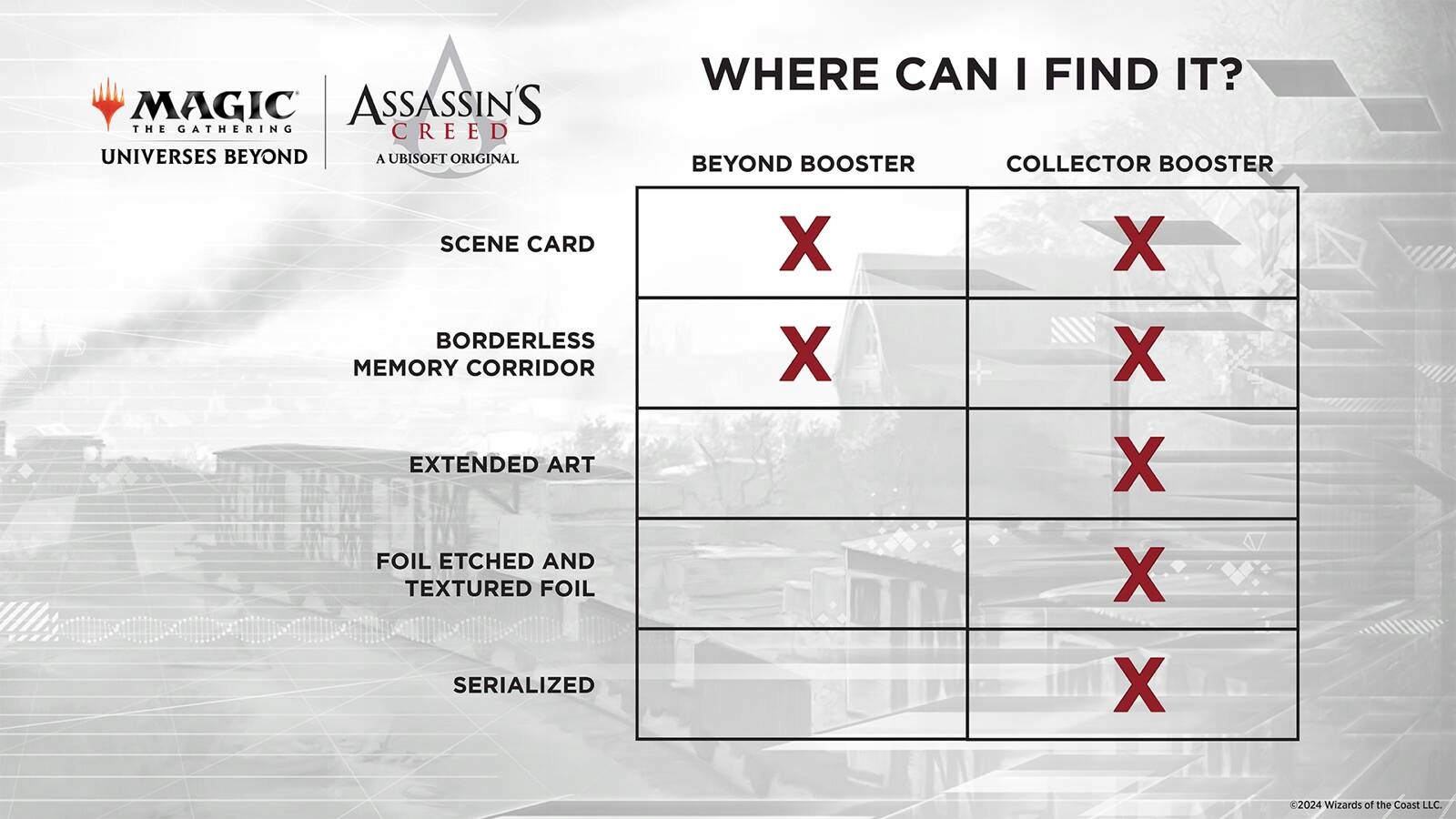 «Assassin's Creed» Add -on содержит в общей сложности 100 обычных карт в системе: 54 карты с необычными раритетами, 32 карты с редкими редкими, 14 картами с редкостью.