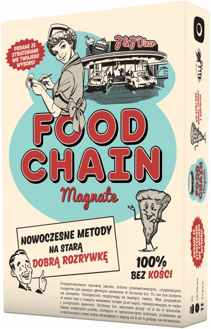 магнат пищевой цепи (польское издание) И очень хорошо, они получат гамбургеры. Я подаю им такие гамбургеры, что этот парень, живущий напротив, никогда не пойдет к своей матери на ужин. Наш новый рекламный щит начинается сегодня днем. И вам все еще нужно инвестировать в почтовое отделение. Наше новое пиво выплеснет из их почтовых ящиков. Этот стейк не жарен! Выпустите этого глупого шеф -повара и нанимайте нового. Быстрее, клиенты ждут! Во время игры мы переедем в Америку 60, где пабы, продающие гамбургеры, выиграли больше толпы клиентов. Будучи президентами крупнейших ресторанов, мы будем продавать продукты питания, проводить маркетинговые кампании и конкурировать друг с другом в достижении наибольшего числа людей. магнат пищевой цепи - это игра для опытных игроков, требующая эффективного управления командой сотрудников, прогнозируя потребности клиентов и соревнований. Игра имеет приятный графический слой, напоминающий стиль эпохи, и огромное количество компонентов, в том числе более 300 карт и 200 деревянных маркеров. b> делится на следующие фазы, и они, в свою очередь, составляют вокруг. На этапе реструктуризации игроки тайно выбирают других сотрудников своей компании, чьи навыки они будут использовать в данном раунде. В игре мы имеем дело с корпоративной лестницей - группа сотрудников подвергается их руководителю, в свою очередь, он находится под кем -то другим и так далее. На самом вертере президент, под которым игрок будет более подчиненным во время игры. 9.00-17.00. Он разделен на несколько шагов. Прежде всего, мы нанимаем новых сотрудников, а во -вторых, мы продвинем этих сотрудников, в -третьих, чтобы увеличить наши диапазоны, мы можем использовать маркетологов для инициирования рекламной кампании. Четвертый шаг - приготовление еды и напитков. На пятом шаге мы можем поместить новые дома клиентов на карте, а в шестом - другое здание нашей сети ресторанов. Для клиентов начинается. Клиент выберет только ресторан, в котором находятся все необходимые им продукты. Если более одного места соответствует этим требованиям, клиент будет руководствоваться приоритетами цены и расстояния ресторана от дома. Средства, полученные на клиентов, оплачиваются у банка. Игра закончится, когда деньги заканчиваются в последнем. >