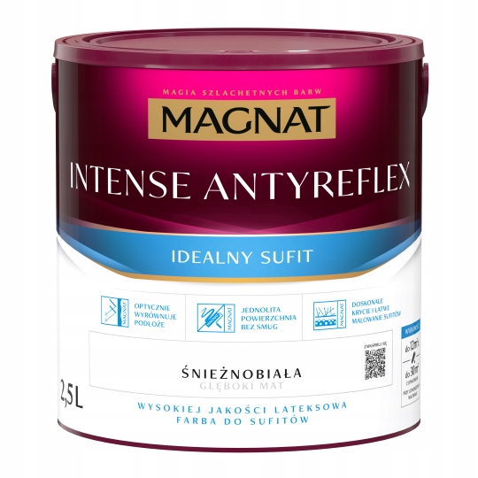 MAGNAT Intense Antireflex — высококачественная латексная краска глубокого матового цвета, созданная специально для покраски потолков. Его инновационная формула обеспечивает превосходное покрытие, оптически выравнивает поверхность и устраняет блики света, благодаря чему поверхность выглядит однородной и без разводов – даже после коррекции.